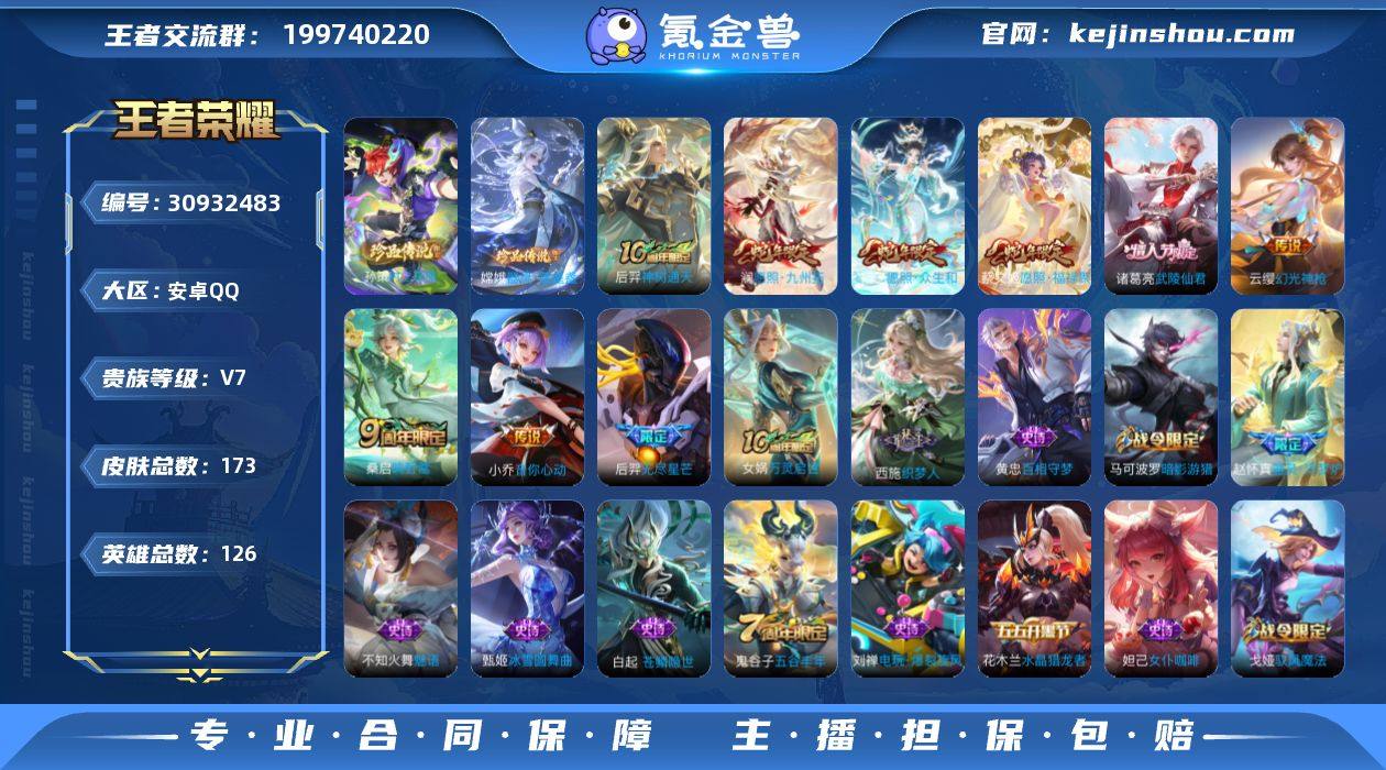 贵族等级:V7 典藏皮肤数:0 珍品无双皮肤数:0 无双皮肤数:0 珍品传说皮肤数:2 传说皮肤数:9 史诗皮肤数:43 皮肤数:173 英雄数:126 段位:钻石