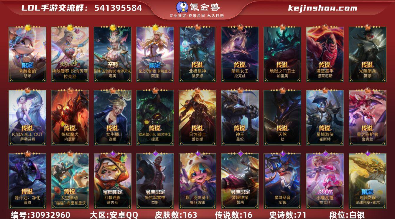 皮肤数:163 典藏皮肤数量:0 神话皮肤数量:4 传说皮肤数量:16 史诗皮肤数量:71 芳醇蜜韵 悠米,桃映暖春 灼灼芳菲 拉克丝,至臻 玉剑传说 寒潭夭夭-唤潮鲛姬,星之守护者阿狸永绽盛芒 段位:白银 卖家说:不玩了,便宜卖