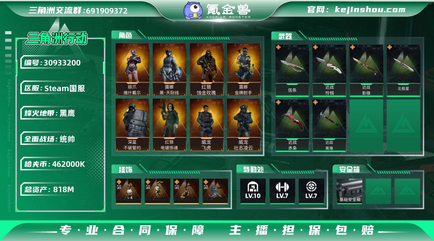 steam国服 4s火彩3s浅色冰彩龙4s绿色金龙 资产818M 现金462M 1612三角卷 满特勤处 赛季限定红较多,有红狼露娜麦晓雯红皮和威龙吴彦祖,影锋,赤霄,怜悯,黑海加北极星。 其他赛季隐藏款挂饰也基本都有 威龙蜂医满熟练度,大战场解锁的枪都升满了,steam还有些别的游戏 有初邮不出售 仅小刀
