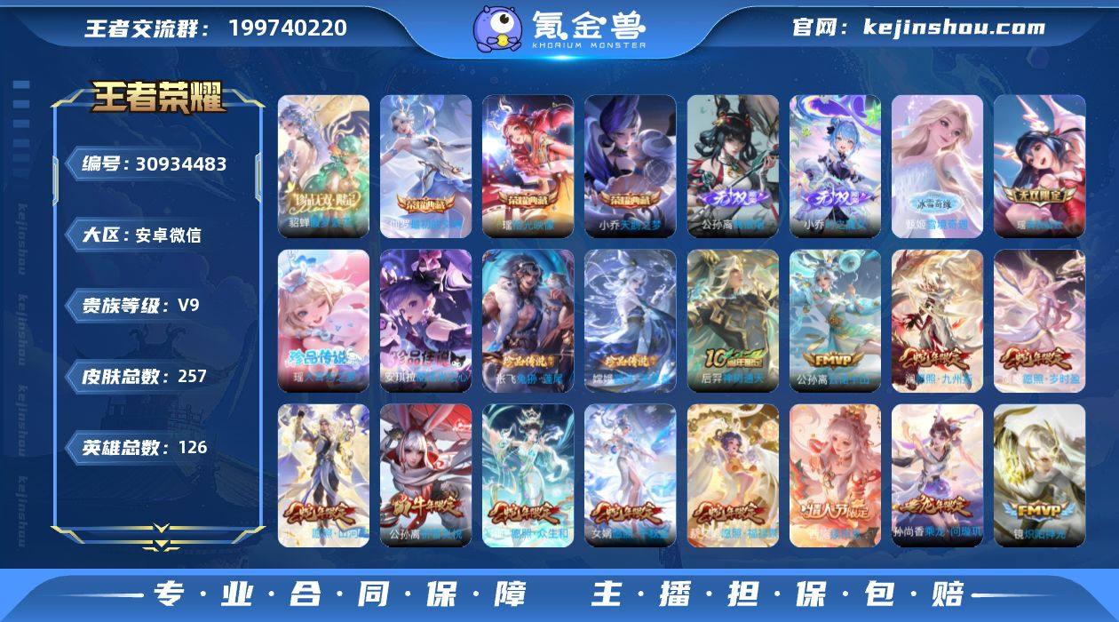 贵族等级:V9 典藏皮肤数:3 珍品无双皮肤数:1 无双皮肤数:4 珍品传说皮肤数:4 传说皮肤数:30 史诗皮肤数:82 皮肤数:257 英雄数:126 段位:星耀 卖家说:微信永久封禁可以正常登录游戏,不介意的可以来拍
