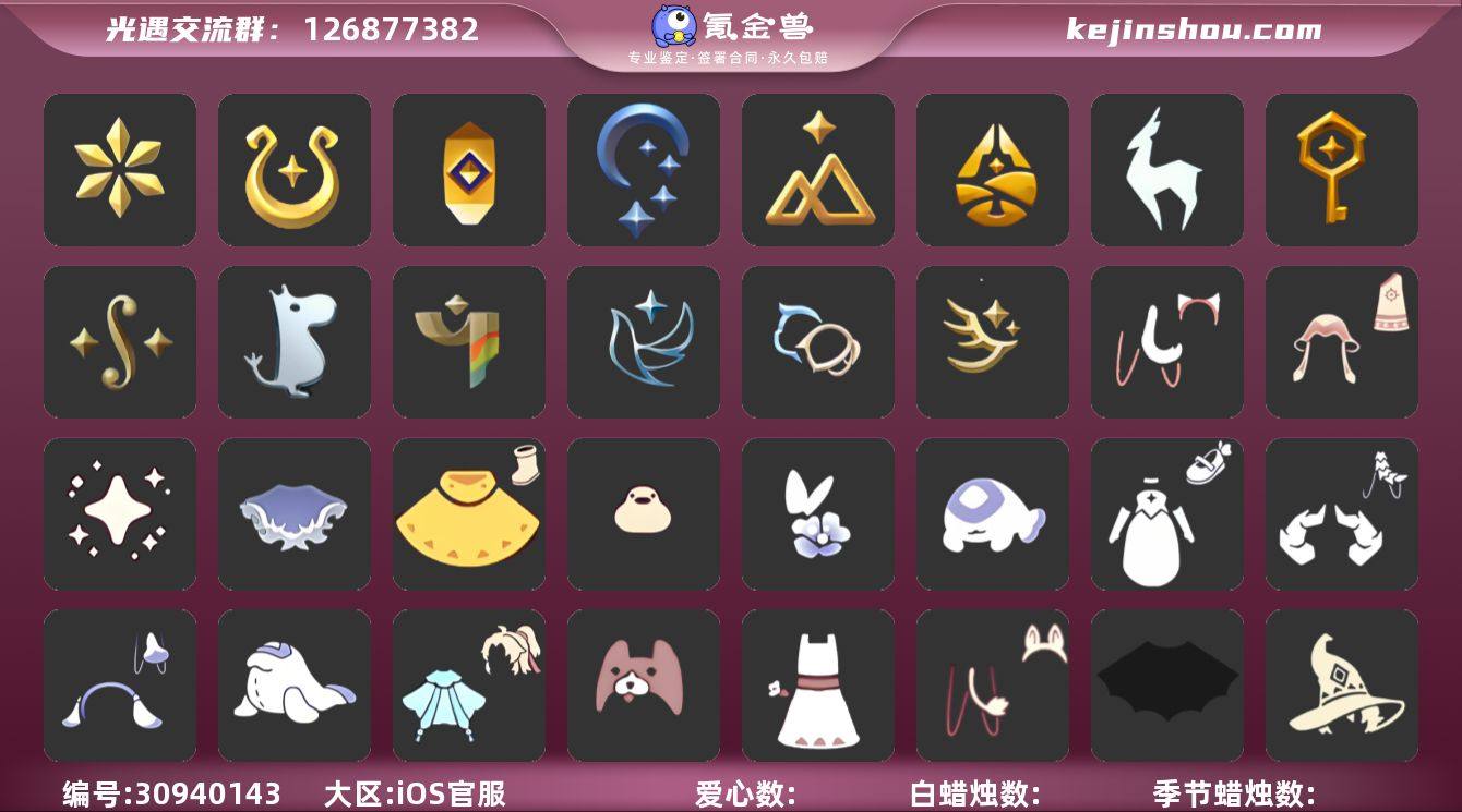 账号类型: 手机账号 季节已毕业: 音韵季,魔法季,夜行季,追忆季,拾光季,归巢季,九色鹿季,筑巢季,二重奏季,姆明季,彩染季,青鸟季,双星季,迁徙季 完成地图: 晨岛,云野,雨林,霞谷,暮土,禁阁,全图毕业 珍稀物品: 白鸟头,魔法季耳坠 礼包: 蝙蝠套,巫师,九色鹿角,莲花斗,兔子鞋,秋千,白绒金,橘子,贝壳,兔子,南瓜,雪花,鲤鱼,水母,星月头饰,彩虹耳钉,新年裤,蝴蝶结,四叶草,暗彩装扮,拖鞋,日光耳环,遥鲲披肩斗篷,姆明饰品套装,向日葵连衣裙,小狗周年发饰,青衫落拓礼包,小黄鸭雨衣套装礼包,小黄鸭发饰礼包,蝴蝶与花发饰礼包,暗陨斗篷礼包,小海牛配饰礼包,海牛玩偶礼包,活力海牛礼包,冥龙套装礼包,周年礼包,记忆水晶礼包,日光水母套装礼包,皮皮猫套装礼包 裤子: 武士裤,背带裤,搓澡巾 面具: 黄鼠狼,红狐狸 面饰: 魔法季耳坠,红耳机 项链: 围巾 发型: 蝴蝶结,正太,樱花,公主头,虚荣,猫耳,白鸟 头饰: 花环 斗篷: 白金,红金,白鸟斗,花瓣斗篷 配饰: 雨伞,高音钢琴,吉他,笛子 亮点: 有迁徙季季卡