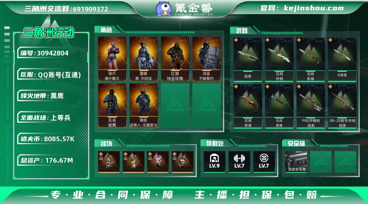 实名:不可二次实名 总资产:176.67M 哈夫币:8085.57K S7顶级安全箱(3x3) 烽火地带段位:黑鹰 烽火地带等级:60 全面战场段位:上等兵 全面战场等级:50 9级仓库,7级训练中心,7级靶场,1级潜水中心,1级收藏室