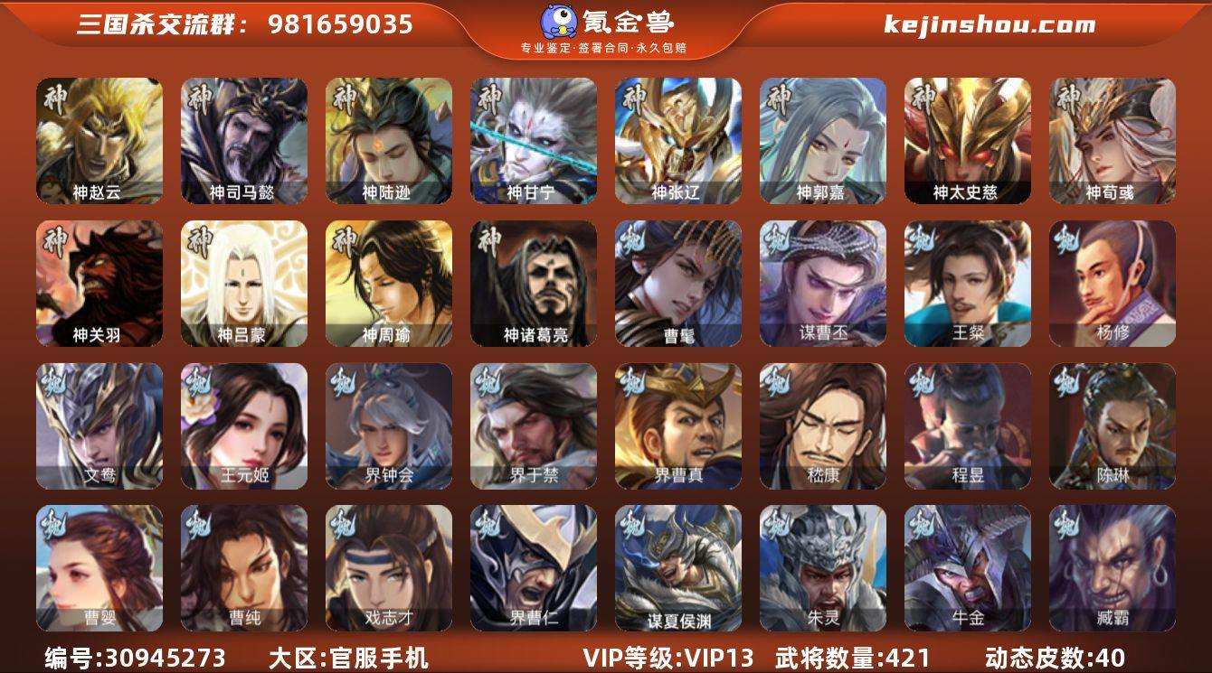 VIP等级: VIP13 官阶: 大将军 武将数量: 421 动态皮肤数量: 40 神将: 神甘宁,神郭嘉,神陆逊,神司马懿,神太史慈,神荀彧,神张辽,神赵云,神关羽,神吕蒙,神周瑜,神诸葛亮 魏国武将: 戏志才,曹纯,曹婴,陈琳,程昱,嵇康,界曹真,界于禁,界钟会,王元姬,文鸯,杨修,王粲,徐庶,张辽,SP蔡文姬,SP曹仁,SP关羽,SP贾诩,SP姜维,SP庞德,卞夫人,蔡贞姬,曹昂,曹操,曹冲,曹洪,曹丕,曹仁,曹叡,贾逵,王异,张恭,鲁芝,界满宠,曹休,界曹植,满宠,荀攸,王基,钟繇,蒯越蒯良,郭嘉,牵招,荀彧,阮慧,杜畿,界郭嘉,崔琰,界曹丕,界荀彧,朱灵,界甄姬,吕虔,界王异,界许褚,界郭淮,华歆,陈群,界邓艾,界典韦,界曹休,司马孚,袁涣,李通,乐进,辛宪英,郭淮,毛玠,界曹彰,郭皇后,夏侯惇,曹植,司马朗,谋于禁,界曹操,许褚,界张辽,张郃,钟会,文聘,曹彰,界夏侯惇,诸葛诞,司马懿,甄姬,界徐晃,徐晃,界曹仁,孙资刘放,韩浩史涣,胡班,曹真,谋曹丕,典韦,界夏侯渊,夏侯渊,李典,于禁,王双,邓艾,界司马懿,张春华,孟达-魏,臧霸,牛金,朱灵(国战),曹髦,谋夏侯渊 蜀国武将: 董允,关索,花鬘,界黄忠,沙摩柯,王平,赵襄,周群,诸葛瞻,谋马超,谋黄月英,徐庶,界魏延,杨仪,吕凯,界关羽,界诸葛亮,邓芝,界伊籍,费祎,严颜,界黄月英,界张嶷,赵云,张松,彭羕,李丰,界刘备,谋姜维,刘封,糜竺,谋庞统,黄月英,关羽,王甫赵累,吴懿,祝融,张飞,黄皓,魏延,界周仓,马忠,界法正,糜夫人,界孟获,刘禅,界赵云,张翼,关银屏,界祝融,SP孙尚香,SP徐庶,卧龙诸葛,周仓,简雍,谋孟获,界关兴张苞,诸葛亮,界张飞,界卧龙诸葛,法正,赵统赵广,界马岱,关平,马岱,界庞统,庞统,诸葛果,谋张飞,马谡,马超,霍峻,来敏,廖化,关兴张苞,孟获,秦宓,吴苋,夏侯氏,姜维,黄忠,刘备,界马超,李严,马良,傅肜,蒋琬费祎,刘谌,蜀-孟达,彭羕(国战),甘夫人,蜀-糜芳傅士仁,势魏延,势陈到 吴国武将: 贺齐,界步练师,界徐盛,留赞,骆统,吴景,周处,文鸯,界...