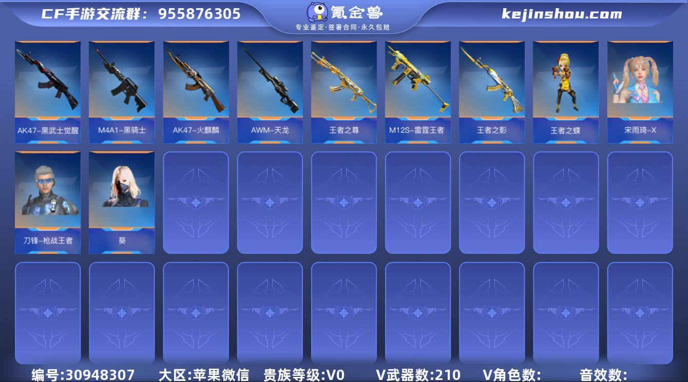 贵族等级:V0 王者武器数:4 v武器数:210 卖家说:苹果微信和安卓微信都可以玩两边装备差不多