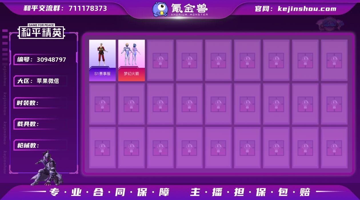 苹果 手Q-3神装-2粉装-13特效枪-1载具-8粉色飞行器-73096热力值-12王牌印记-135套装-218枪皮HZ257172 【红色神装等级】:幽焰骑士-维塔(一级),精灵之光-露米娜(一级),沙丘之主-图卡盟(三级) 【红色角色神装】:幽焰骑士-维塔,精灵之光-露米娜,沙丘之主-图卡盟 【热门品类】:套装-龟仙人,套装-浪漫波比,角色-8号机 【粉色套装】:角色-千金淑猫,粉装-星穹咏叹调 【粉色枪皮等级】:AKM-幽焰骑士(三级),SCAR-L-锦绣绵绵(五级),M416-电玩时刻(五级),M416-墨龙九天(三级),GROZA-精灵之光(三级),GROZA-镜光银凌(五级),AUG-暖羊咩咩(五级),M762-青锋波束(五级),UMP45-量子极限(五级),Kar98K-巳巳如意(五级),M24-镜域双华(三级),Mk14-甜梦熊击(五级),破片手榴弹-热量炸弹(七级) 【粉色载具】:仰望U9(赤霞丹朱) 【粉色枪皮】:AKM-幽焰骑士,SCAR-L-锦绣绵绵,M416-电玩时刻,M416-墨龙九天,GROZA-精灵之光,GROZA-镜光银凌,AUG-暖羊咩咩,M762-青锋波束,UMP45-量子极限,Kar98K-巳巳如意,M24-镜域双华,Mk14-甜梦熊击,破片手榴弹-热量炸弹 【粉色飞行器】:酣梦熊熊飞行器,沙丘之主天马,镜域双华-灵镜之阶,龙翔九天飞行器,曦光华影飞行器,幽焰列车飞行器,万象金身飞行器 【粉色降落伞】:百万伏特降落伞,彩虹甜喵降落伞,镜域双华降落伞,精灵梦叶罗丽降落伞,墨龙九天降落伞,精灵之光降落伞,幽焰骑士降落伞,千金淑猫降落伞,月影灵韵降落伞,幻星舰长降落伞 【稀有套装】:套装-龟仙人,套装-绒宝小鹅,套装-巳巳如意,套装-雏菊兔兔,套装-萝兰蝴蝶,套装-小熊娃娃,套装-火种守卫者,套装-糖糖葫芦,套装-青团波波,套装-棉花软糖,角色-都市丽猫,角色-许七安,套装-燕燕于飞,套装-鱼渊荷华,套装-晶辉守护,角色-蜜桃派对,套装-粉恋花,套装-紫幽梦,套装-蓝冰羽,角色-猎...