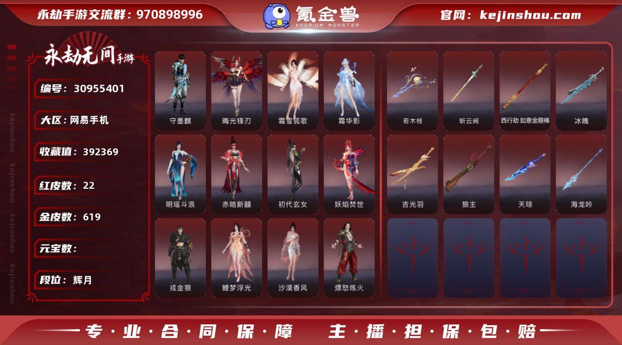 WJ3683,网易手机手游,1月31可换绑,四人段位辉月5,22红,619金,御祥云,金焰狐舞,神君印,神乌造像,炎烈珠,御海之灵,赤瑛,炽切,九幽冷焰,初樱绮梦,冰魄,吉光羽,斩云阙,狼主,海龙吟,如意金箍棒,天琼,若木枝,妖焰焚世,鲤梦浮光,霜华影c