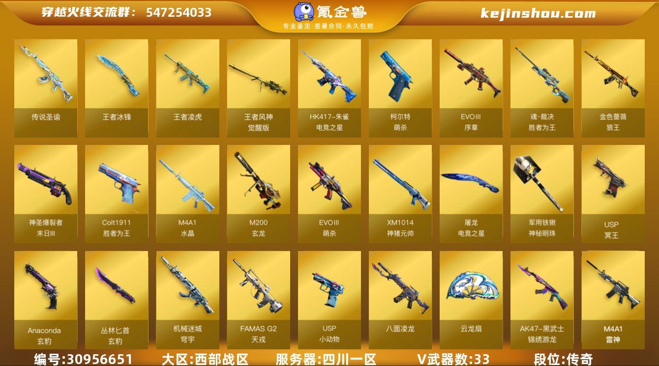 段位:传奇 VIP等级:VIP5 V武器数:33 王者武器数:3 传说圣谕 王者冰锋,王者凌虎,王者风神-觉醒版 Colt1911-胜者为王,EVOⅢ-萌杀,EVOⅢ-序章,魂·裁决-胜者为王,HK417-朱雀-电竞之星,金色蔷薇-狼王,军用铁锹-神秘明珠,柯尔特-萌杀,M200-玄龙,M4A1-水晶,神圣爆裂者-末日III,屠龙-电竞之星,XM1014-神猪元帅,Anaconda-玄豹,丛林匕首-玄豹,USP-冥王,机械迷城-穹宇,FAMAS G2-天戎,USP-小动物,八面凌龙,云龙扇,AK47-黑武士-锦绣游龙,M4A1-雷神,M4A1-黑骑士,M4A1-猎神,M200-幻神,Barrett-毁灭,Barrett-极光,QBZ03-金色蔷薇,Scar Light-白虎,龙啸,擎天,炽芒蝶刃,USP-雷暴,斩神刀-雷暴,幻灵之锋,裁决,天神,M4A1-苍鸣雷神 传说星骇,传说影煞 华,兰-海滩派对,零·纪元 HK417-朱雀-电竞之星-竞星跃动音效卡,屠龙-电竞之星-竞星跃动音效卡,M200-幻神音效卡,AWM-裁决音效卡,M4A1-黑骑士音效卡 卖家说:爆破生化双全装双泡泡象裁决幻神三件套蝴蝶刀等等