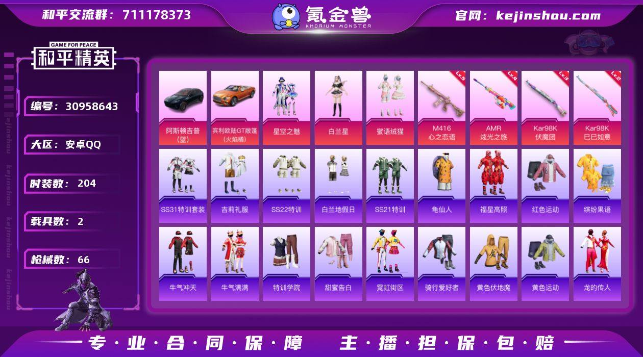 实名: 可修改 时装数: 204 载具数: 2 枪械数: 66 战备数: 47 热门装扮: 星空之魅,白兰星,蜜语绒猫 载具: 阿斯顿·马丁DBX(蓝),宾利欧陆GT敞篷(火焰橘) 稀有枪皮: Kar98K伏魔团,M416心之恋语,AMR炫光之旅,Kar98K-巳巳如意