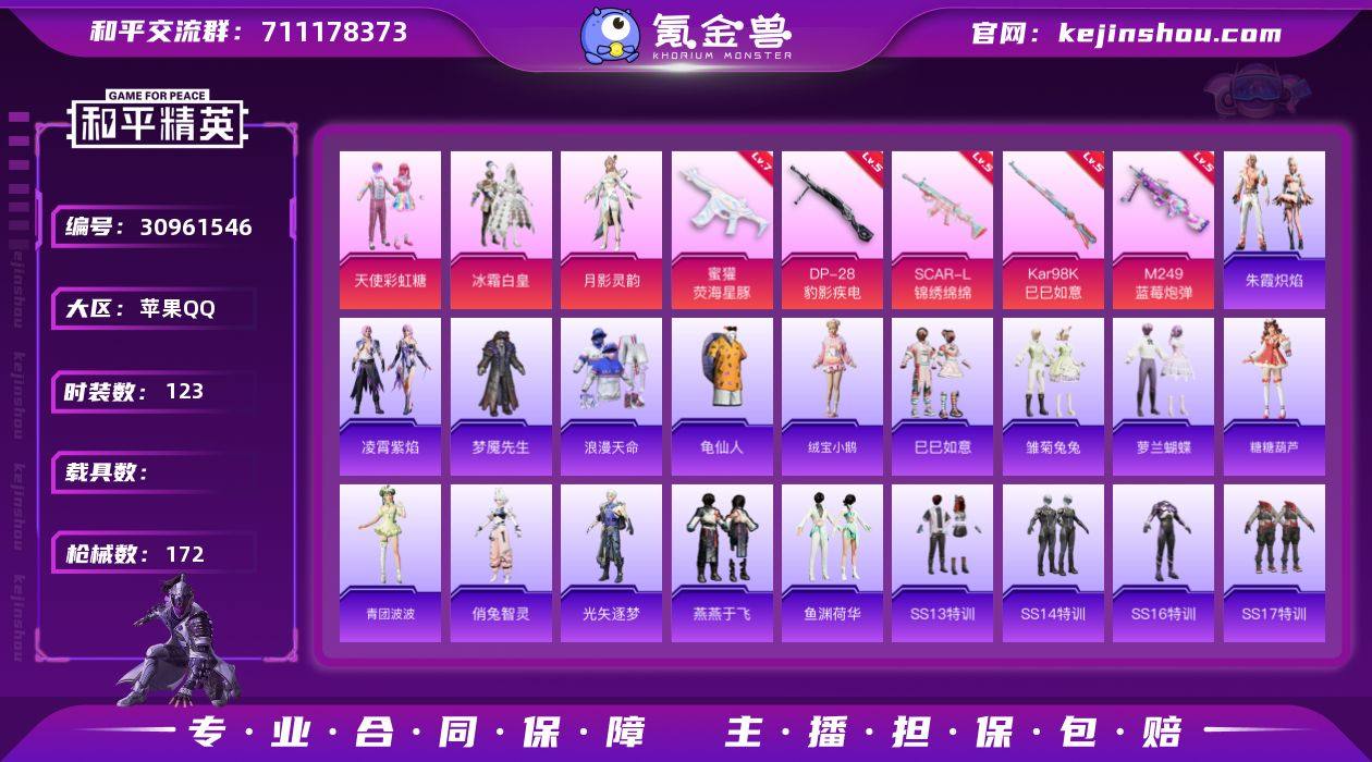 苹果 手Q-3粉装-5特效枪-0载具-1粉色飞行器-51590热力值-9王牌印记-123套装-172枪皮【热门品类】:套装-浪漫天命,套装-龟仙人【粉色套装】:粉装-天使彩虹糖,粉装-冰霜白皇,角色-月影灵韵【粉色枪皮等级】:SCAR-L-锦绣绵绵(五级),蜜獾-荧海星豚(七级),Kar98K-巳巳如意(五级),M249-蓝莓炮弹(五级),DP-28-豹影疾电(五级)【粉色枪皮】:SCAR-L-锦绣绵绵,蜜獾-荧海星豚,Kar98K-巳巳如意,M249-蓝莓炮弹,DP-28-豹影疾电【粉色降落伞】:暗夜玫瑰降落伞,洛神天依降落伞,蓝莓炮弹降落伞,临安公主降落伞,月影灵韵降落伞,炫彩糖果降落伞【稀有套装】:套装-龟仙人,套装-绒宝小鹅,套装-巳巳如意,套装-雪国风尚,套装-炫彩糖果,套装-雏菊兔兔,套装-萝兰蝴蝶,套装-糖糖葫芦,套装-青团波波,角色-俏兔智灵,角色-光矢逐梦,套装-燕燕于飞,套装-鱼渊荷华,套装-朱霞炽焰,套装-凌霄紫焰【稀有枪皮】:AKM-夜灯,AKM-彩虹符号,AKM-星之彼岸,AKM-破晓战魂,AKM-萌趣颜团子,AKM-虎虎生威,AKM-霓虹街区,M16A4-幻世战舞者,M16A4-甜心亚梦,SCAR-L-夏日绵绵冰,SCAR-L-炫彩节奏,SCAR-L-玉兔迎春,SCAR-L-红色方程式,M416-红色方程式,M416-蓝色火焰,GROZA-治愈之星,AUG-天降萌叽,AUG-耀粉歌者,AUG-月影灵韵,QBZ-彩虹符号,QBZ-洛神天依,M762-瑞龙福将,M762-镭射皇者,Mk47-洛神天依,G36C-炙焰牛王,G36C-星穹咏叹调,AC-VAL-天降萌叽,AC-VAL-甜心亚梦,蜜獾-天降萌叽,ARX-凌霄紫焰,UZI-啾咪啾咪,UZI-天降萌叽,UZI-炫彩节奏,UZI-月影灵韵,UMP45-涂山之恋,UMP45-蓝色火焰,UMP45-极意拳锋,Vector-焰鹰斗篷,Vector-彩虹符号,Vector-治愈之星,Vector-生命誓言,汤姆逊-耀粉歌者,野牛-夜灯,MP5K-蓝莓炮弹,JS9-凌霄紫焰,P90-巳巳如意,Kar98K-红色方程式,M24-治愈之星,AWM-焰鹰斗...