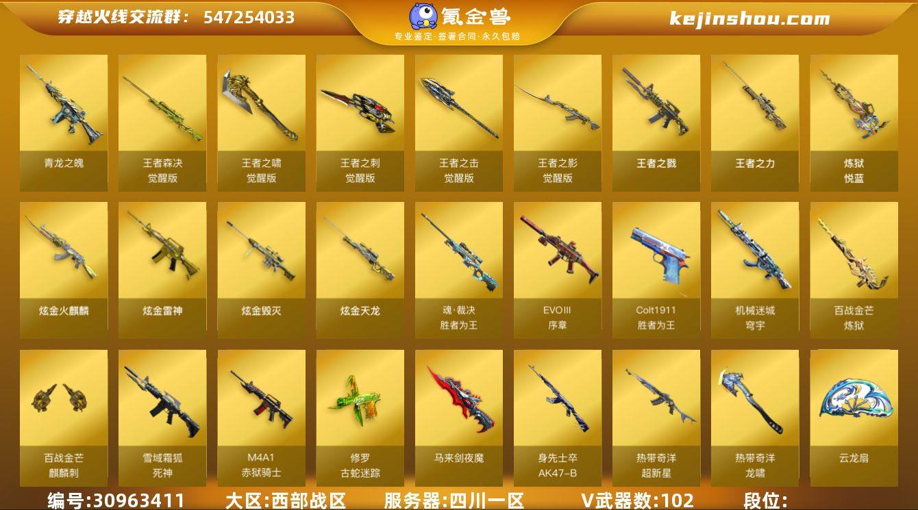 西部战区(四川一区)ys【精品爆破生化号】【附赠七万一点券】102v【M200-幻神+双皮/宠儿+N9,Kar98k-星神套+皮/AG-S21冠军,宙斯套装,ScarLight-白虎+皮/AG-S23冠军,HK417-朱雀,QBZ03-金色蔷薇,凤吟之魄,青龙之魄,AWM-裁决+皮/流光秘银,6烈龙+死亡之眼,柯尔特-竞技荣光,白虎-九尾白狐,HK21-领域力场,QBZ03-吕布,海神三叉戟,猫猫手套】10王者【王者森决,王者之影,王者之戮,王者之力,王者之刺,王者之击,王者之啸,炼狱-悦蓝】5炫金【炫金雷神,炫金天龙,炫金毁灭,炫金火麒麟】9角色【星际战将,樱,零·纪元,战地猎狐,葵-阿尔法武装,奇洋探员,蛇隐宗,王者-魅影,雪域霜狐】7音效【Kar98k-星神音效卡,AWM-裁决音效卡,Barrett-毁灭音效卡,M4A1-黑骑士音效卡,死神-雪域霜狐-怀旧音效卡,炼狱-百战金芒-庆典舞曲音效卡,麒麟刺-百战金芒-庆典舞曲音效卡】50皮【幻神-宠儿-2021MVP,幻神-N9-2022MVP,星神-AG-CFPLS21冠军,白虎-白鲨-CFPLS23冠军,炼狱-钟馗,黑骑士-白马银枪,毁灭-星耀,屠龙-星耀,炼狱-电子连击,雷神-CFS十周年纪念版,黑龙-冠军之武,龙啸-巅峰荣耀,火麒麟-巅峰荣耀,裁决-流光秘银,黑鲨-电流骇客,火麒麟-战神关羽,毁灭-星空,雷神-宠儿-2019MVP,火麒麟-雷神,毁灭-SV-CFPLS16冠军,黑骑士-AG-S4冠军典藏,毁灭-冠军之怒,屠龙-荣耀之锋】挑战枪【毁灭征服者-超越MAX】截图展示段位不代表实际段位 如赛季更新等不可抗拒因素发生变化、时限道具不保证所剩时间