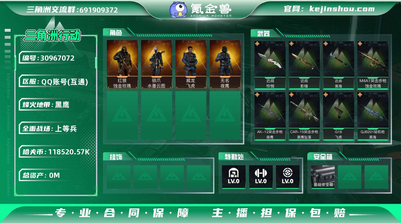 01102|精品脱坑资产号 总资产807.4M 流动资产554.9M 全红皮 飞虎 夜鹰 无题 不破 特勤处全满 540发aw 超多咖啡豆 北极星 怜悯 影锋 黑海 信条 M7棱镜攻势极品SQQ区 哈夫币:118520571 干员外观数:10 近战数:6 典藏数:19 枪械数:301 载具数:57 烽火地带等级:60 全面战场等级:37 烽火地带段位:黑鹰 全面战场段位:上等兵 特勤处:技术中心Lv.3|工作台Lv.3|制药台Lv.3|防具台Lv.3 捆绑包:飞虎捆绑包|信条捆绑包|北极星捆绑包|黑海捆绑包|纵横捆绑包|死神玫瑰捆绑包|鹅鸭杀捆绑包|特斯拉线圈捆绑包|无机神经元捆绑包|黑·天际线枪械捆绑包|捞点薯条捆绑包|工业审判捆绑包|幻想曲捆绑包 干员外观:骇爪-维什戴尔|蛊-能天使·午夜邮差|露娜-黑·天际线|骇爪-水墨云图|红狼-蚀金玫瑰|露娜-金牌射手|深蓝-不破誓约|蜂医-送葬人·无题密令|威龙-飞虎|无名-夜鹰 近战:信条|北极星|黑海|影锋|怜悯|黑鹰 枪械:K437突击步枪-北极星|腾龙突击步枪-死神玫瑰|腾龙突击步枪-捞点薯条|AS Val突击步枪-死神玫瑰|CAR-15突击步枪-黑鹰坠落|CAR-15突击步枪-阿米娅|G3战斗步枪-无机神经元|G3战斗步枪-骑士|SCAR-H战斗步枪-铁艺苍穹|SCAR-H战斗步枪-水墨云图|SCAR-H战斗步枪-启航|AK-12突击步枪-纵横|AK-12突击步枪-特斯拉线圈|AK-12突击步枪-夜鹰|SG552突击步枪-运动员|ASh-12战斗步枪-鹅鸭杀|M4A1突击步枪-蚀金玫瑰|M4A1突击步枪-阿米娅|M7战斗步枪-棱镜攻势S2|QCQ171冲锋枪-鹅鸭杀|QCQ171冲锋枪-北极星|勇士冲锋枪-能天使·午夜邮差|SR-3M紧凑突击步枪-特斯拉线圈|SMG-45冲锋枪-骑士|UZI冲锋枪-特斯拉线圈|Vector冲锋枪-能天使·午夜邮差|P90冲锋枪-信条|MP5冲锋枪-黑海|杠杆式步枪-纵横|PSG-1射手步枪-黑·天际线|SR-25射手步枪-信条|SR-25射手步枪-水墨云图|AWM狙击步枪-捞点薯条|R93狙击步枪-维什戴尔|G17-无机神经元|93R-捞点薯...