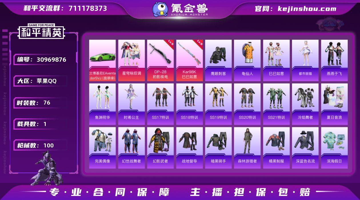 苹果 手Q-1粉装-2特效枪-1载具-1粉色飞行器-27647热力值-3王牌印记-76套装-100枪皮 【热门品类】:套装-龟仙人 【粉色套装】:粉装-星穹咏叹调 【粉色枪皮等级】:Kar98K-巳巳如意(五级),DP-28-豹影疾电(五级) 【粉色载具】:兰博基尼Aventador SVJ(翡翠绿) 【粉色枪皮】:Kar98K-巳巳如意,DP-28-豹影疾电 【粉色飞行器】:齐天大圣飞行器 【粉色降落伞】:极限特训降落伞,垂柳戏鸭降落伞,闲梦青缨降落伞,千金淑猫降落伞 【稀有套装】:套装-龟仙人,套装-巳巳如意,角色-都市丽猫,套装-燕燕于飞,套装-鱼渊荷华,角色-时希公主 【稀有枪皮】:AKM-彩虹符号,AKM-灼热熔岩,AKM-生命誓言,AKM-破晓战魂,AKM-虎虎生威,AKM-霓虹街区,AKM-玄冥寒域,M16A4-红色方程式,M16A4-蓝色火焰,SCAR-L-暗夜玫瑰,SCAR-L-炫彩节奏,SCAR-L-玉兔迎春,SCAR-L-红色方程式,M416-夜灯,M416-糯团青竹,M416-红色方程式,M416-蓝色火焰,GROZA-影袭,AUG-耀粉歌者,AUG-闲梦青缨,QBZ-彩虹符号,M762-天降萌叽,M762-瑞龙福将,G36C-暗夜玫瑰,AC-VAL-天降萌叽,蜜獾-天降萌叽,蜜獾-娇憨猪猪,UZI-天降萌叽,UZI-娇憨猪猪,UZI-影袭,UZI-炫彩节奏,UZI-红色方程式,UMP45-夜灯,UMP45-炫光之旅,UMP45-蓝色火焰,Vector-生命誓言,Vector-创世·救赎,汤姆逊-奇异狩猎者,汤姆逊-炫彩节奏,汤姆逊-耀粉歌者,P90-巳巳如意,Kar98K-梦幻火箭,Kar98K-炫彩节奏,Kar98K-红色方程式,AWM-垂柳戏鸭,Mini14-炫彩节奏,Mini14-穿刺龙虾,Mini14-耀粉歌者,Win94-瑞龙福将,SLR-娇憨猪猪,S686-生命誓言,S686-红色方程式,S686-巳巳如意,S1897-炫彩节奏,S12K-瑞龙福将,S12K-破晓战魂,S12K-娇憨猪猪,DBS-圣堂之誓,M249-破晓战魂,DP-28-彩虹符号,MG3-幻世战舞者,MG3-瑞龙福将,大砍刀-鬼刀,破片手榴弹-巳巳如意 【...