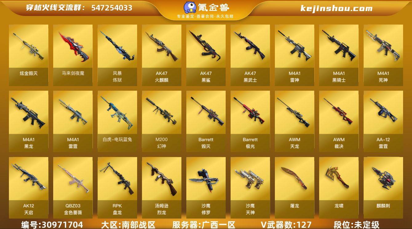 广西一区-130V-7王者-1炫金 【热门武器】:QBZ03-金色蔷薇,M200-幻神,M200-竞技荣光,死亡之眼*2,荣耀世冠-火麒麟,白虎-电玩蓝兔,金色小号,炼狱-迷你小钢,M4A1-黑骑士,汤姆逊-烈龙*5,RPK-盘龙*6,斯泰尔-蝴蝶,羊驼玩偶*5,裁决-雪莉杨*2,火麒麟-绝迹,沙鹰-修罗*4 【王者炫金武器】:炫金毁灭 【音效卡】:M4A1-黑骑士音效卡,Barrett-毁灭音效卡 【稀有皮肤】:幻神-宠儿-2021MVP,雷神-能量核心,M4A1-战神赵云,雷神-宠儿-2019MVP,火麒麟-AG战队皮肤,火麒麟-华夏之心,AK47-火麒麟-传奇EVEN,火麒麟-轻羽皮肤,火麒麟-平天大圣,火麒麟-百城,火麒麟-心动糖果,黑骑士-冠军之势,黑骑士-伏羲,毁灭-星空,毁灭-战神张飞,毁灭-风暴,AWM-天龙-传奇70KG,AWM-天龙-传奇白鲨 【角色】:王者-魅影,王者-迷迭香,魅影,炫,电竞教官-云悠悠,蜀雪,炽天使,青霞仙子 【人偶武器】:火麒麟-绝迹,裁决-雪莉杨*2,斯泰尔-蝴蝶,Barrett-夜玫瑰,M37-葵,COP-旗袍,炼狱-迷你小钢,迷你超能女侍,迷你生化手雷,深渊终结者手雷,闪光弹-小乔,闪光弹-貂蝉,高爆手雷-大乔 【暴走生化】:斯泰尔-蝴蝶,炼狱-迷你小钢,死亡之眼*2,超级对讲机 【挑战大师】:神圣爆裂者III*2,阐释者III,激光毁灭者III-白马银枪*2 【英雄级武器】:M200-竞技荣光,柯尔特-竞技荣光,擎天-竞技荣光,高爆手雷-竞技荣光*6,烟雾弹-竞技荣光*7,闪光弹-竞技荣光*7,幻灵之锋,马来剑-夜魔,斩神刀-雷暴,M4A1-雷霆*2,荣耀世冠-火麒麟,QBZ03-金色蔷薇,白虎-电玩蓝兔,M4A1-雷神*3,M4A1-黑龙,M4A1-黑骑士,M4A1-死神,RPK-盘龙*6,汤姆逊-烈龙*5,AK47-火麒麟*3,AK47-黑武士*2,AK12-天启,AWM-天龙*3,Barrett-毁灭*3,Barrett-极光,AWM-裁决,AA-12-雷霆,M200-幻神,AK47-黑鲨*2,