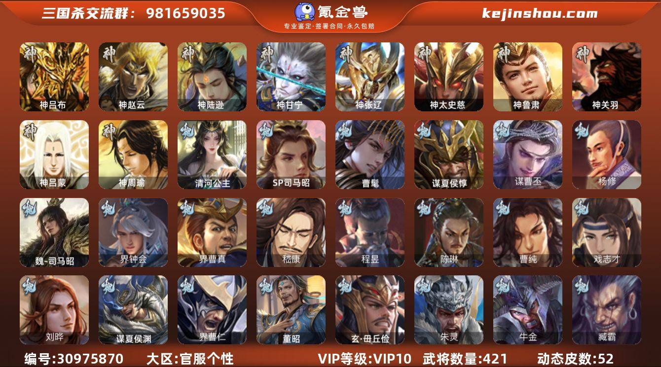 VIP等级: VIP10 官阶: 大将军 武将数量: 421 动态皮肤数量: 52 神将: 神甘宁,神陆逊,神吕布,神太史慈,神张辽,神赵云,神关羽,神吕蒙,神周瑜,神鲁肃 魏国武将: 刘晔,戏志才,曹纯,陈琳,程昱,嵇康,界曹真,界钟会,魏-司马昭,杨修,唐咨-魏,张辽,SP蔡文姬,SP曹仁,SP关羽,SP贾诩,SP姜维,SP庞德,卞夫人,蔡贞姬,曹昂,曹操,曹冲,曹洪,曹丕,曹仁,曹叡,贾逵,王异,张恭,鲁芝,界满宠,曹休,界曹植,满宠,荀攸,王基,钟繇,蒯越蒯良,郭嘉,牵招,荀彧,阮慧,杜畿,界郭嘉,崔琰,界曹丕,界荀彧,朱灵,界甄姬,吕虔,界王异,界许褚,界郭淮,华歆,陈群,界邓艾,界典韦,界曹休,司马孚,袁涣,李通,乐进,辛宪英,郭淮,界曹彰,郭皇后,毌丘俭,夏侯惇,曹植,司马朗,谋于禁,界曹操,许褚,界张辽,谋徐晃,张郃,钟会,文聘,曹彰,界夏侯惇,诸葛诞,司马懿,甄姬,杨阜,界徐晃,徐晃,界曹仁,孙资刘放,韩浩史涣,胡班,曹真,谋曹丕,典韦,界夏侯渊,夏侯渊,李典,于禁,邓艾,界司马懿,张春华,孟达-魏,臧霸,牛金,朱灵(国战),谋夏侯惇,曹髦,玄·毌丘俭,清河公主,SP司马昭,董昭,谋夏侯渊 蜀国武将: 董允,花鬘,界黄忠,谯周,沙摩柯,张星彩,赵襄,谋马超,谋赵云,马云騄,徐庶,界魏延,杨仪,吕凯,界关羽,界诸葛亮,邓芝,界伊籍,胡金定,费祎,严颜,界黄月英,界张嶷,赵云,张松,彭羕,李丰,界刘备,界刘禅,谋姜维,刘封,糜竺,谋庞统,黄月英,刘巴,关羽,王甫赵累,吴懿,吴班,祝融,张飞,黄皓,魏延,界周仓,谋祝融,马忠,界法正,糜夫人,界孟获,刘禅,界赵云,界姜维,张翼,关银屏,界祝融,SP孙尚香,SP徐庶,卧龙诸葛,宗预,周仓,简雍,界关兴张苞,诸葛亮,孙乾,界张飞,界卧龙诸葛,法正,界简雍,赵统赵广,陈到,界马岱,关平,马岱,界庞统,庞统,诸葛果,谋张飞,马谡,马超,霍峻,廖化,关兴张苞,孟获,秦宓,吴苋,夏侯氏,姜维,黄忠,刘备,界马超,李严,马良,傅肜,蒋琬费祎,刘谌,彭羕(国战),甘夫人,蜀-糜芳傅士仁,SP甘夫人 吴国武...