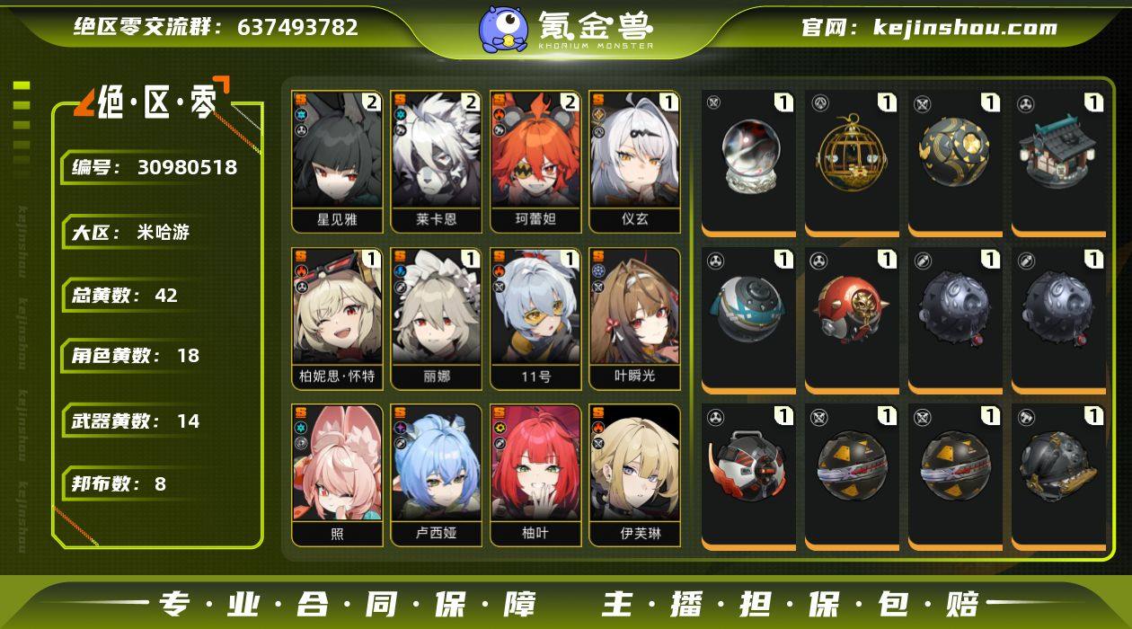 冒险等级:59 总黄数:42 菲林底片数量:6 菲林数量:1466 加密母带数量:1 五星角色数:18 2命星见雅,2命莱卡恩,2命珂蕾妲,1命仪玄,1命柏妮思·怀特,1命丽娜,1命「11号」,0命叶瞬光,0命照,0命卢西娅,0命柚叶,0命伊芙琳,0命耀嘉音,0命浅羽悠真,0命月城柳,0命艾莲,0命猫又,0命格莉丝 五星武器数:14 1精云霓孤光,1精青溟笼舍,1精心弦夜响,1精霰落星殿,1精时流贤者,1精灼心摇壶,1精啜泣摇篮,1精嵌合编译器,1精硫磺石,1精拘缚者,1精燃狱齿轮,1精深海访客 邦布数量:8 2精格列佛探员,1精芽芽,1精狮耶,1精咔嚓仔,1精赤红莫库斯,1精鲨牙布,1精飚速布,1精共鸣布 狡黠甜心,墨形影踪,晴空化狸,水晶灯下,漪光夜曲 卖家说:欧皇号,皮肤多,目前大保底,可以给叶补角色,大小月卡全部都有,地图主线都没过,上手直接爽玩,随便观35级,大量资源可以挖