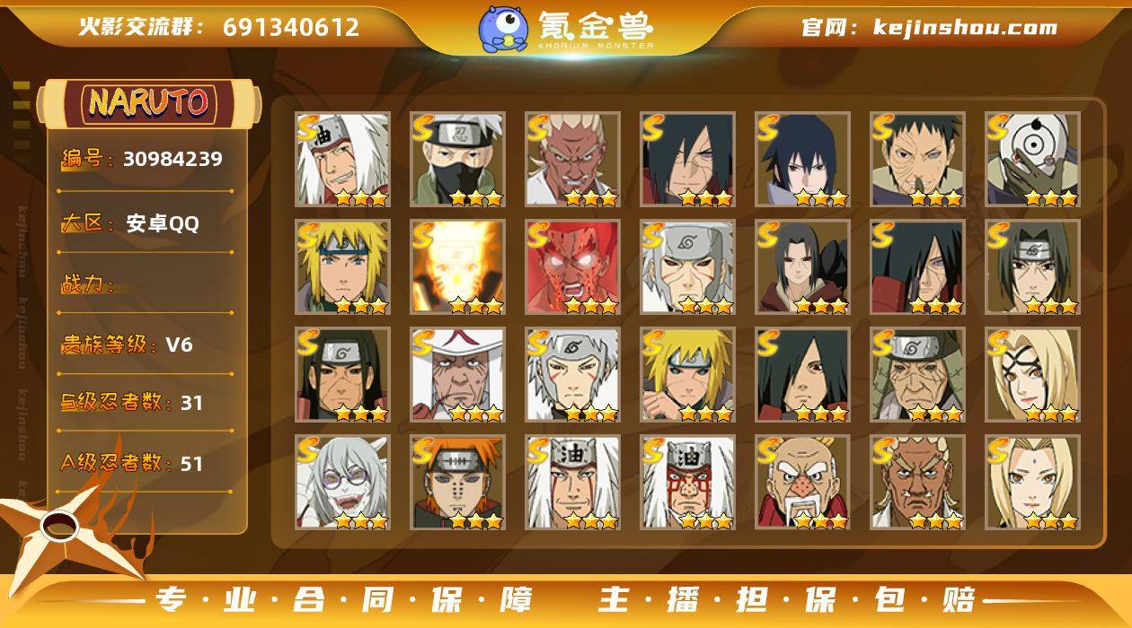 0AQYVT 号 VIP6,1805W战力,S忍31个,A忍51个,本服排名157,战区排名未上榜,通灵兽318个,8时装,中忍2阶,忍者星数625