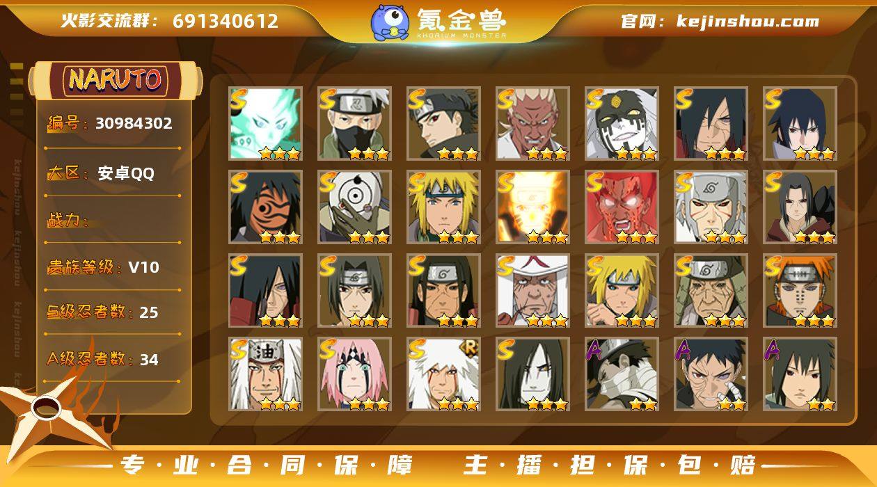 0AQYVS 号 VIP10,1303W战力,S忍25个,A忍36个,本服排名131,战区排名未上榜,通灵兽320个,7时装,上忍1阶,忍者星数502
