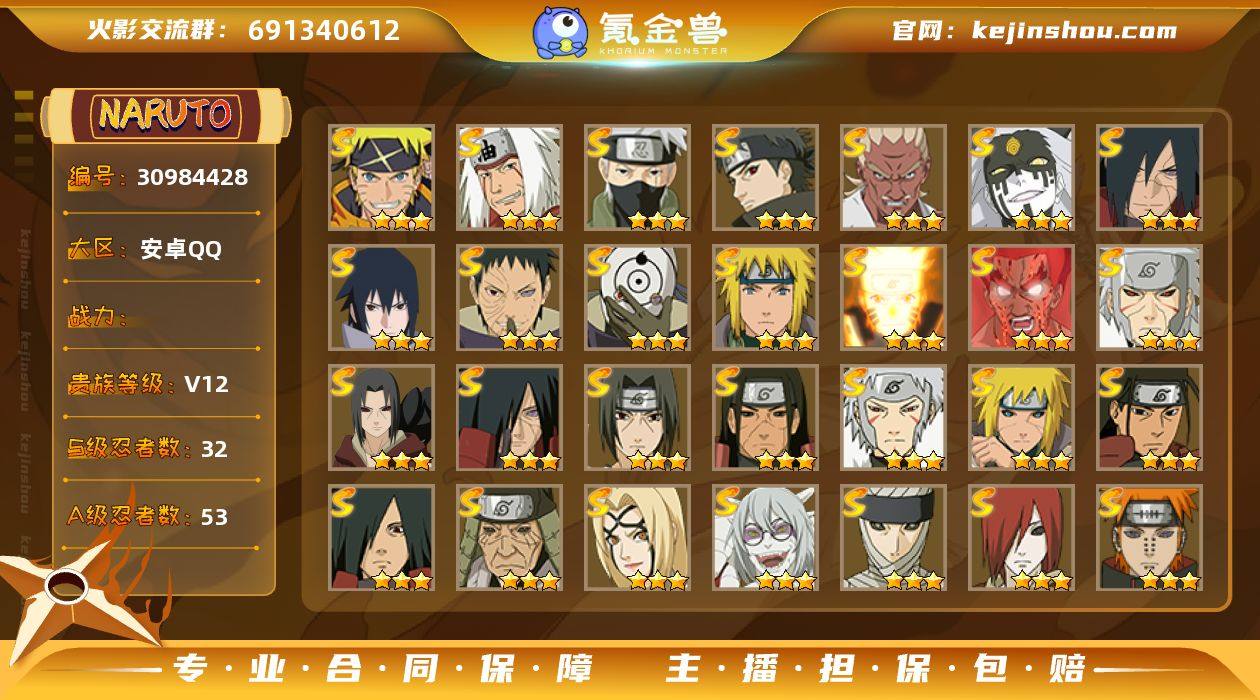0ASE7R 号 VIP12,1238W战力,S忍32个,A忍56个,本服排名526,战区排名未上榜,通灵兽319个,7时装,影级1阶,忍者星数631 0ASE7R 号 VIP12,1236W战力,S忍32个,A忍56个,本服排名545,战区排名未上榜,通灵兽19个,7时装,点券10,金币3385,高招券27,上忍1阶,忍者星数631