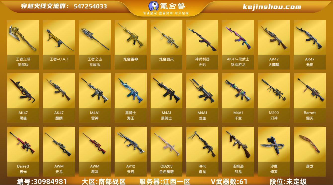 江西一区-62V-7王者-2炫金 【热门武器】:QBZ03-金色蔷薇,M200-幻神,死亡之眼,Kar98K-星神,C.A.T,炼狱-迷你小钢,M4A1-黑骑士*2,汤姆逊-烈龙*6,RPK-盘龙*6,斯泰尔-蝴蝶,羊驼玩偶,沙鹰-修罗*2 【王者炫金武器】:炫金雷神,炫金毁灭 【音效卡】:烈火-动感闪耀 音效卡,M4A1-雷神音效卡,M4A1-黑骑士音效卡,Barrett-毁灭音效卡 【皮肤】:雷神-耀金皮肤,火麒麟-平天大圣,火麒麟-心动糖果,毁灭-星空,毁灭-冠军之怒,毁灭-直播专属,M4A1-千变-孔明皮肤,黑骑士耀金皮肤,无影-能量核心,无影耀金皮肤,战神-粉色甜心皮肤,AK47-B-常胜将军-曹操,AK47-B-常胜将军-刘备,AK47-B-常胜将军-孙权,修罗-能量核心 【角色】:葵,王者-葵-貂蝉,乔伊教练,初恋灵狐,风暴女,嘉年华灵狐,零-水下丽影,潜龙队-X,邱刚敖,斯沃特-X,新灵狐者,海豹突击队 【人偶武器】:炼狱-迷你小钢,斯泰尔-蝴蝶,AWM-灵狐-15周年嘉年华,海滩汪汪-巴雷特,COP-旗袍,C.A.T,迷你深渊冰龙,夺魂,深渊终结者手雷,闪光弹-貂蝉,高爆手雷-大乔,COP-青花瓷-斯沃特精英,AK47-斯沃特,M200-夜玫瑰,灵狐娃娃手雷 【暴走生化】:死亡之眼,超级对讲机 【挑战大师】:冰龙粉碎者-白马银枪*3,激光毁灭者III-白马银枪*2,激光毁灭者III,神圣爆裂者-末日III 【英雄级武器】:M4A1-千变,AK47-火麒麟*2,AK47-麒麟,M4A1-雷神*2,M4A1-黑骑士*2,AK47-无影,AK12-天启,AK47-黑鲨,M4A1-龙血*2,无影-神兵利器,黑武士-锦绣游龙,QBZ03-金色蔷薇,烈火-动感闪耀,王者之心-觉醒版,王者之势-觉醒版,AK-47-猩红传说,黑骑士-海王,AK47-B-常胜将军,AWM-天龙,Barrett-毁灭,Barrett-极光,AWM-裁决,M200-幻神,Kar98K-星神,王者之光-觉醒版,RPK-盘龙*6,汤姆逊-烈龙*6,沙鹰-修罗*2,天神-动感