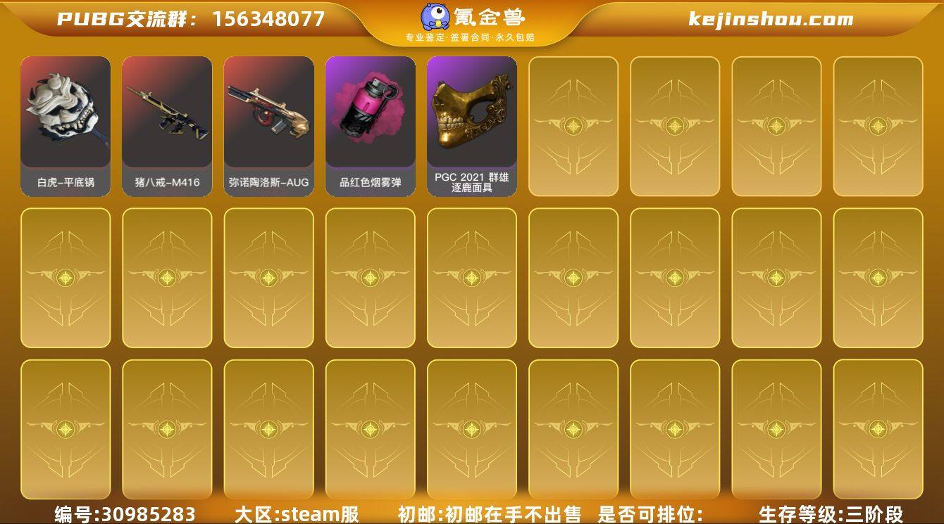 JDPZ11103 生存500级可排位/10级爆裂弹球-AUG/4级赛博危机-MK12/1级妖魔之触-ACE32/3级猛虎猎手-KAR98K/金面具/发光手臂/白熊套/星魂白运动/拉风龙-风华套装/拉风龙-勇往套装/黄色烟枪/Pigff战术突击夹克/尼尔头/G-DRAGON PEACEMINUSONE/ 0B86I1号 无排名, 生存等级620, 名誉等级2, 金标数量4, 图纸1, 聚合物882, 枪皮数量54, [成长型] 爆裂弹球 - AUG[10级], [成长型] 妖魔之触 - ACE32[1级], [成长型] 赛博危机 - Mk12[4级]