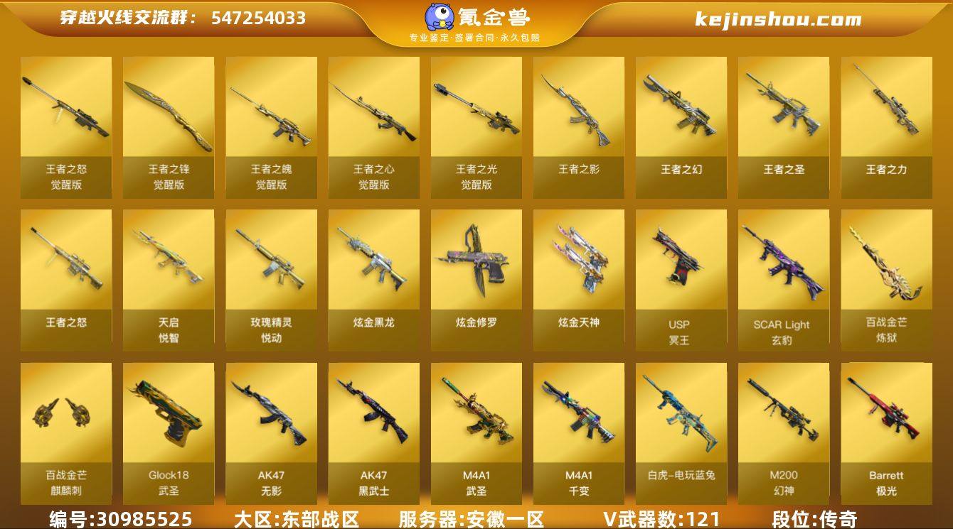 【自带包赔 最高三倍】:东部战区-Lv.102-荣耀元帅-段位传奇1-安徽一区-121V-21王者-4炫金 【传说角色】:传说星骇(四防) 【热门武器】:M200-幻神,Cat-刀锋,加特林-炼狱*4,M4A1-黑骑士*8,牛牛-AK47,QBZ03-金色蔷薇,RPK-盘龙*2,死亡之眼,沙鹰-修罗*6,汤姆逊-烈龙*7,白虎-电玩蓝兔 【特殊枪械】:6黑骑士,6烈龙,2盘龙,4炼狱 【王者炫金武器】:王者之圣,王者之幻,王者之势*2,王者之影,王者之怒,王者之力,王者之锋*2,炫金骑士,炫金黑龙,炫金天神,炫金修罗,天启-悦智,玫瑰精灵-悦动,王者玄武,盘龙-悦心*3,王者冰锋 【音效卡】:AWM-裁决音效卡,M4A1-黑骑士音效卡,麒麟刺-百战金芒-盛典舞曲音效卡,炼狱-百战金芒-庆典舞曲音效卡 【皮肤】:毁灭-暗月*3,毁灭-荣耀之怒,黑骑士-暗月,黑骑士耀金皮肤,雷神-荣耀之魄,雷神-虎将,天龙-能量核心,天神-暗月*2,屠龙-荣耀之锋,无影耀金皮肤,裁决-运输船 皮肤,雷神-暗月,M4A1-再燃火线,火麒麟-雷神,毁灭-魔灵皮肤,毁灭-英雄计划 皮肤,黑龙-能量核心,无影-暗月,无影-能量核心,死神-秘银,天启-暗月*4,战神-粉色甜心皮肤,战神-紫绶金章皮肤,战神-流金岁月皮肤,极光-能量核心,修罗-能量核心*3,屠龙-惊鸿 皮肤,龙啸-黯钢战甲 皮肤,轻型军用手斧-再燃火线 【角色】:机械姬,葵,零,零-水下丽影,蜀雪,铁骑荣耀,王者-零,王者之瞳,樱,乔伊教练,修道士,云海玲珑,兰妹妹,灵狐者-黄金海岸,潘多拉-X,潘多拉-甜心教官,潜龙队-X,新娜塔莎,雪莉杨,影武者-X 【人偶武器】:COP-旗袍,Cat-刀锋,夺魂,M4A1-雷神-精英刀锋,迷你深渊冰龙,迷你波特博士,迷你曼提柯尔,迷你火种,迷你生化手雷*2,牛牛-AK47,深渊终结者手雷,闪光弹-小乔,异变清道夫-蛇影双骄,M37-奇洋探员 【暴走生化】:死亡之眼 【...