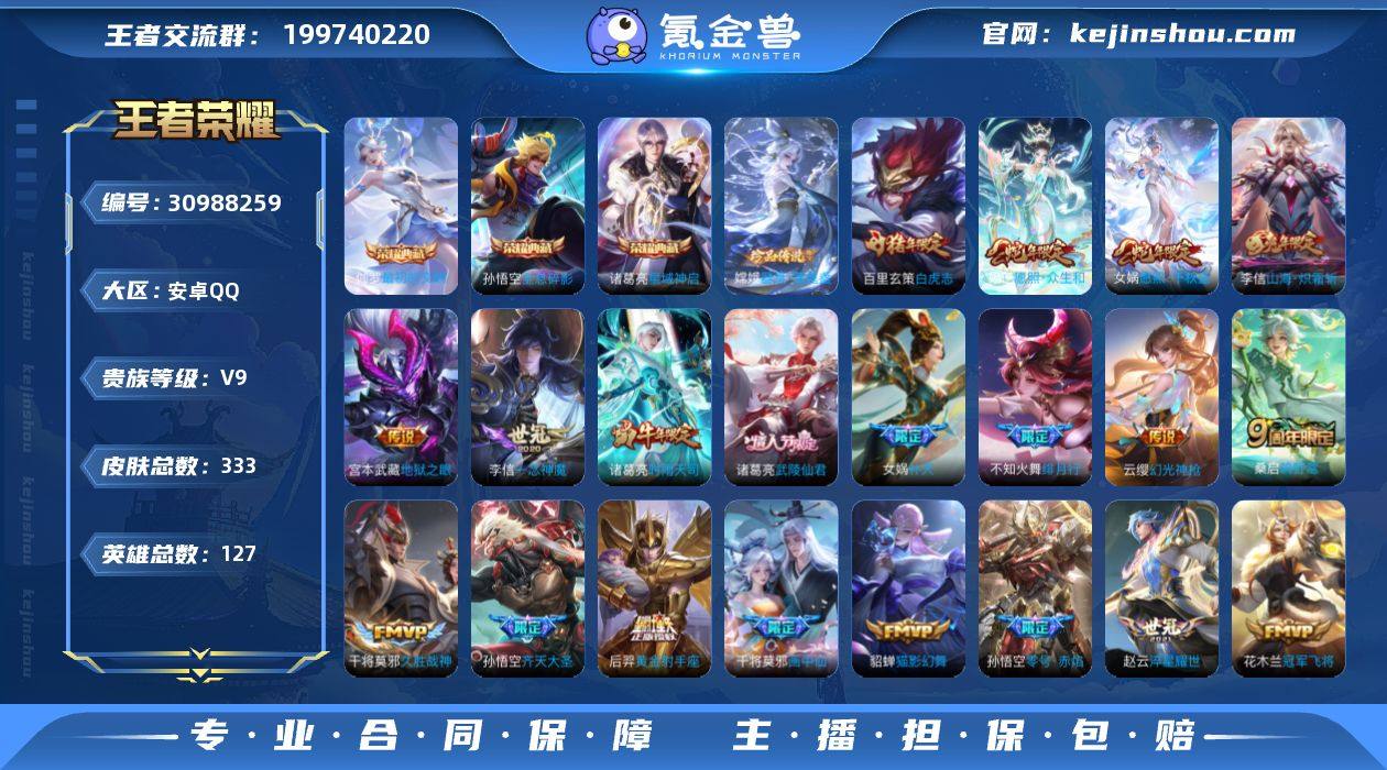【王者荣耀】珍品无双0 典藏3 无双0 珍品传说1 传说29 史诗85 英雄127 皮肤333 贵族9级 荣耀典藏:全息碎影|星域神启|最初的交响__珍品传说:器灵·落星盏__传说皮肤:鸣野蒿|音你闪耀|补天|绛天战甲|启明星使|胖达荣荣|地狱之眼|孙策-末日机甲|久胜战神|狄仁杰-超时空战士|黄金射手座|猫影幻舞|刘备-时之恋人|一念神魔|冠军飞将|乞巧织情|淬星耀世|绯月行|画中仙|齐天大圣|白虎志|零号·赤焰|时雨天司|武陵仙君|周瑜-音你心动|山海·炽霜斩|幻光神枪|愿照·众生和|愿照·千秋盛__稀有限定:至尊宝|朱雀志|虞姬-霸王别姬|大圣娶亲|孙行者|傲雪梅枪|李小龙|梁祝|山海·玄木吟|狮舞东方|暗影游猎|冰锋战神|大漠名商|繁星吟游|古海寻踪|海滩派对|海盐诗旅|航海奇遇记|胡桃夹子|华丽摇滚|幻夜卜梦|皇家上将|混沌棋|火炮绅士|剑破天穹|金庭之子|凯尔特女王|狂想玩偶喵|炼金王|迷踪丽影|魔术师|千军破阵|擒涛扼浪|穷奇|驱傩正仪|沙漠行僧|朔风刀|死亡摇滚|醍醐杖|天穹祈灯|万华元夜|无心|五谷丰年|纤云弄巧|星界游侠|星空之诺|演武夺筹|疑决卦|阴阳师|银河之约|优雅恋人|遇见飞天|御旌|御銮|御狮|原初追逐者|云间偶戏|真爱魔法|逐梦之影|暗夜猫娘|暗隐猎兽者|缤纷独角兽|冰冠公主|冰雪圆舞曲|苍穹之光|乘风破浪|大乔-猫狗日记|德古拉伯爵|地狱岩魂|电玩小子|伽罗-琥珀纪元|功夫厨神|鬼剑武藏|黄金分割率|箭羽风息|节奏热浪|金属风暴|龙骑士|吕布-末日机甲|魅力维加斯|梦奇-顽趣|女仆咖啡|偶像歌手|热力回旋|圣诞狂欢|水果甜心|水晶猎龙者|孙策-猫狗日记|天才门将|晚萤|赵云-未来纪元|星夜王子|摇滚巨星|鹰眼统帅|幽灵船长|月团寄思|钟无艳-超时空战士|逐浪之夏|紫霞仙子|修罗|曙光守护者|心灵战警|千年之狐|孙尚香-时之恋人|无限星赏官|舞动绿茵|特工魅影|心灵骇客|谧流熔炉|万物之道|器灵·浮梦炉|化蝶舞|御霄|烛龙|原初探秘者|重...