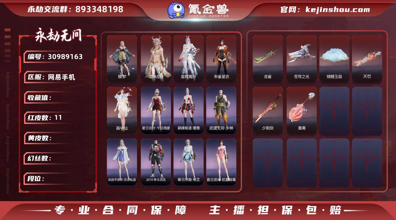 版本: 终极版 等级: 276 幻丝数: 238 红皮数: 9 金皮数量: 196 红皮: 墨离(飞索皮肤),绝代风华(迦南皮肤),熛怒炼火(季沧海皮肤),狼主(阔刀皮肤),泣珠龙纱(崔三娘皮肤),朱雀星衣(沈妙皮肤),西行劫·如意金箍棒(棍皮肤),天琼(匕首皮肤),化道者(哈迪皮肤) 宁红夜金皮: 九阴圣女,玄豹姿,2674·嘉斯威珀,耀世魂花 特木尔金皮: 追猎,护世四法·多闻天王 迦南金皮: 神鹰之女 季沧海金皮: 游四海,龙心炽焰,2674·街头烈火,信手斩龙 胡桃金皮: 清雅少女,贵胄少女,夏日派对·高校水着 天海金皮: 若水尊者,九骊之君 妖刀姬金皮: 阴阳师·灼舞桃节 崔三娘金皮: 阿娜希塔,绿野守护·暗沼摩罗 岳山金皮: 弘毅袍 无尘金皮: 幽篁山鬼,封神录·申公豹 玉玲珑金皮: 日影花阴 殷紫萍金皮: 新倩女幽魂·瑶光沐月,沐昭,智绘·萍之缘 沈妙金皮: 絮云衣,绿野守护·悠竹萌客 胡为金皮: 葫芦兄弟·蛤蟆头领 季莹莹金皮: 护世四法·持国天王 魏轻金皮: 正法袍 张起灵金皮: 绿野守护·山漠狞影 飞索金皮: 暗香 长剑金皮: 壶中日月,侠骨·清光引,2674·原型 太刀金皮: 念珠丸 阔刀金皮: 山君怒,龙蟠,青石猊 斩马刀金皮: 神龙刀 长枪金皮: 白虹,建木,长虹,劫垢·堀,武道无穷·潜龙,藤魂 棍金皮: 打狗棒,戒律杖,学宫之杖,护世四法·降魔 匕首金皮: 仙舞,桡尺刀 扇金皮: 耀夜流华 双节棍金皮: 精武,镇魔杵,法持 双刀金皮: 破重云,天之刑,天威,空寒 双戟金皮: 隐天渊 横刀金皮: 白鹿 万刃轮金皮: 穷奇 拳刃金皮: 绿野守护·毛乎乎 弓箭金皮: 春水,青花,逆逢 远程金皮: 石中火(鸟铳),天心玉(鸟铳),竹霹雳(火炮),墨不归(火炮),造景(火炮),玉飞梭(鸟铳),金蝎(鸟铳),镇海(连弩),钻山(火炮),绿野守护·雨幕(鸟铳),迎宵(五眼铳) 饰品金皮: 阴阳灵狐(胡桃后腰),业火残红笛(宁红夜右腰),怒狼铜盔(特木尔头部),福虎帽(胡桃头部),癸卯兔(顾清寒头部),圣鹰纱(迦南面部),龙火坛(季沧海左前腰),降魔钵·嗔(天海右后腰),【2025年1.16可二次换绑、期间可登录网易大神正常玩游戏】