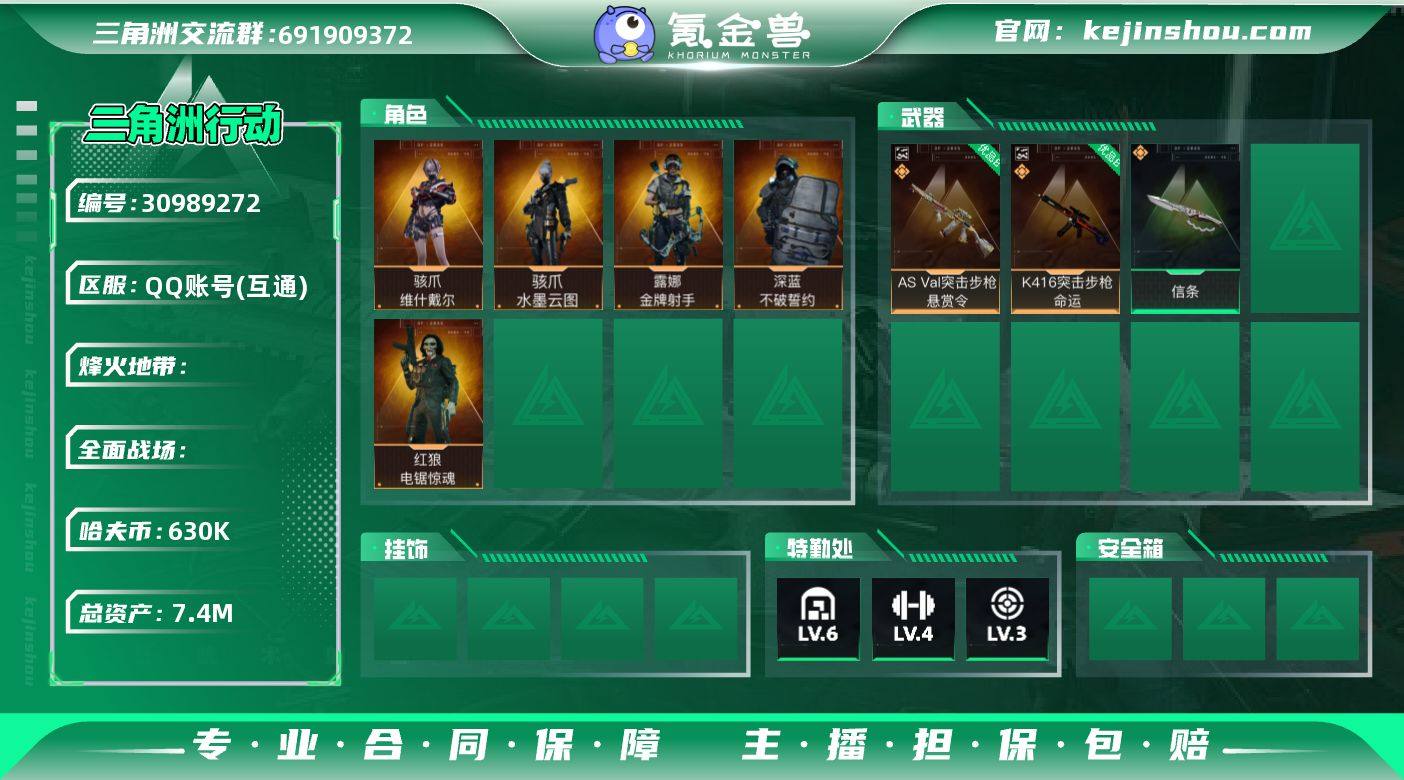 JHS2693-总资产7.4m-63w哈夫币【仓库6,体力4,耐力3】【信条】【水墨云图,骇爪-维什戴尔,红狼-电锯惊魂,露娜-金牌射手,深蓝-不破誓约】【K416命运(优品B),ASVal悬赏令(优品B)】