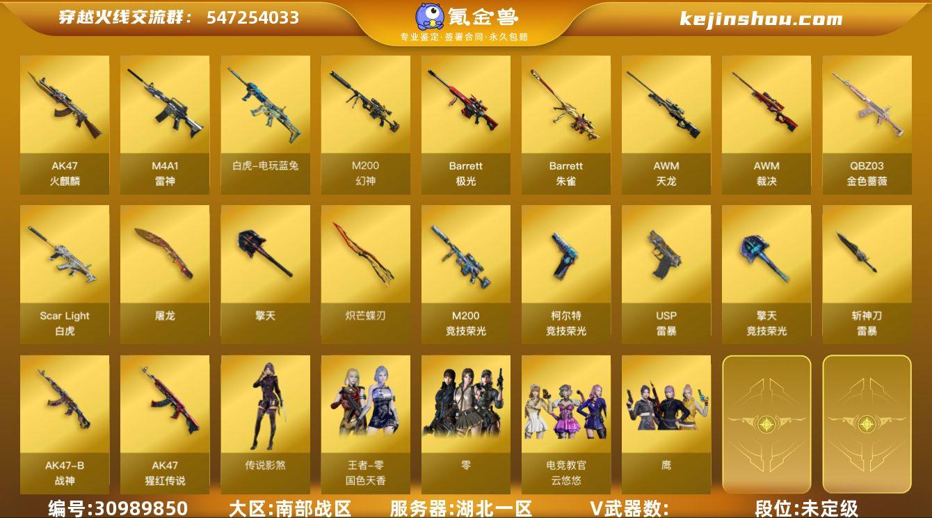 [16103667]8097/南部/湖北一区/可排位/115v/传说影煞/传说星骇/【幻神三件套/幻神/幻神宠儿/幻神音效卡】/【200竞技荣光套装/200竞技荣光/柯尔特竞技荣光/擎天竞技荣光/】/【金色蔷薇套装/QBZ金色蔷薇/金色蔷薇热带奇洋/金色蔷薇音效卡】/王者蔷薇/觉醒版/白虎/白虎热带奇洋音效卡/白虎电玩蓝兔/青龙之魄/COP雷霆/USP雷暴/*2/COP云龙/柯尔特无冕之王/柯尔特冠军之特/炽芒蝶刃/【四防角色】/电竞教官云悠悠/王者零国色天香/【角色】/零/鹰/不败狙神/零纪元/战地猎狐/幻面灵狐/葵阿尔法武装/奇洋探员/乔伊教练/蛇隐宗/修道士/云海玲珑/【音效卡】/极光音效卡/炼狱百战金芒音效卡/碧霄极光音效卡/修罗盛典舞曲音效卡/ 屠龙电竞之星音效卡/昌龙怀旧音效卡/朱雀电竞之星音效卡/竞魂超新星音效/【枪皮】/屠龙星火燎原/裁决典雅胡桃/雷神源计划2.0/星神巅峰荣耀/擎天冠军之击/【小人枪】/朱雀蛇隐宗/雷神精英刀锋/火麒麟零纪元/水枪不败狙神/裁决雪莉杨/天龙曼陀罗/KAC锯式机枪黑桃战神/斯泰尔蝴蝶/斯泰尔幻面灵狐/永久AC/钱包无法注销/找回包赔
