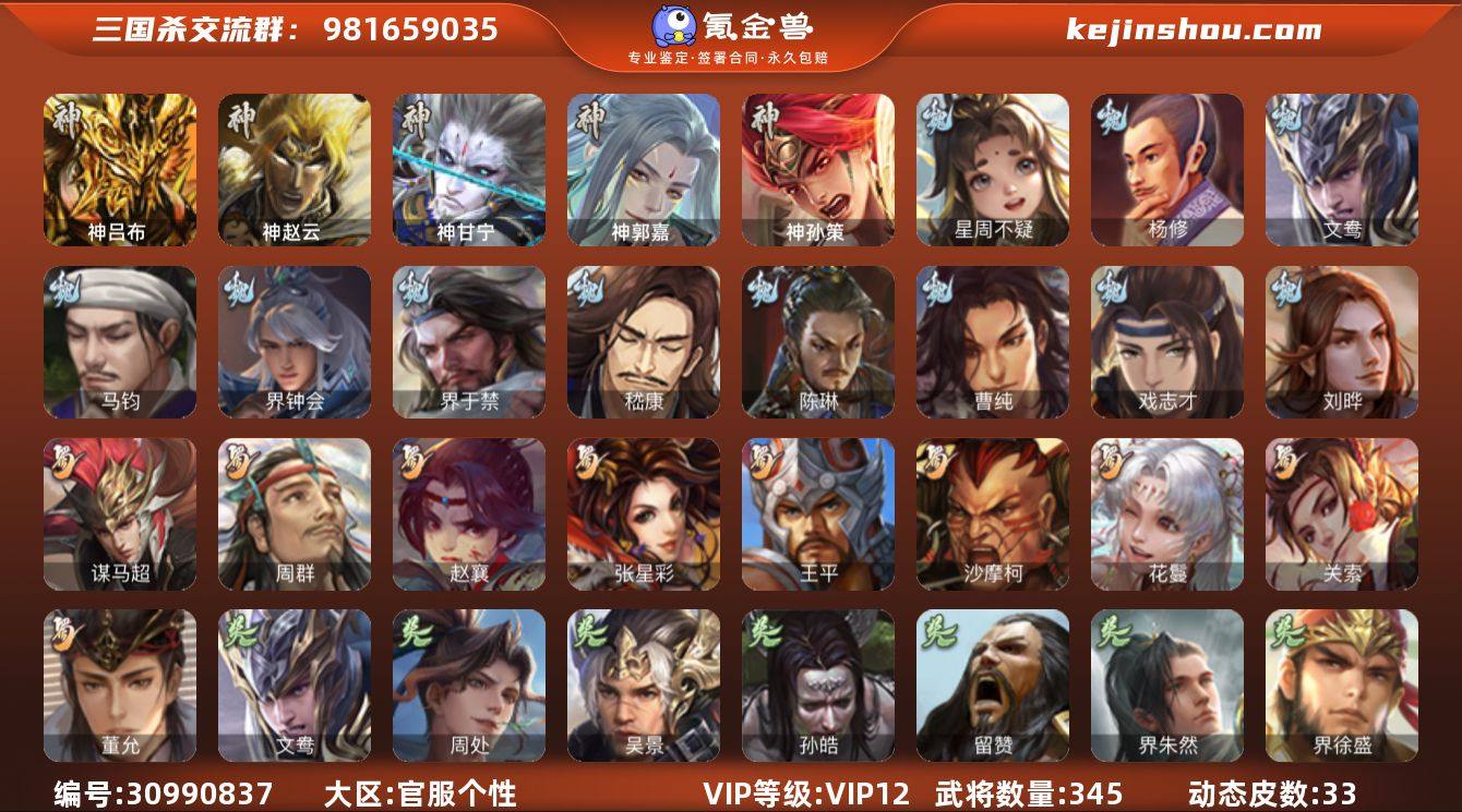 官阶:大将军;VIP等级:VIP12;史诗武将数量:46;动态皮肤数量:33;武将总数:345;史诗宝珠数量:15;将魂数量:1429;神将:8;魏国史诗武将:19;蜀国史诗武将:9;吴国史诗武将:7;群史诗武将:13 神吕布,神赵云,神甘宁,神郭嘉,神孙策,神关羽,神吕蒙,神周瑜,星周不疑,杨修,文鸯,马钧,界钟会,界于禁,嵇康,陈琳,曹纯,戏志才,刘晔,关索,谋马超,周群,赵襄,张星彩,王平,沙摩柯,花鬘,董允,周处,吴景,孙皓,留赞,界朱然,界徐盛,界步练师,左慈,麹义,南华老仙,刘璋,刘焉,沮授,界左慈,界李儒,公孙康,杜预,张绣,李傕,许攸,神郭嘉-虎年清明(动态),神甘宁-万人辟易(动态),神曹操-天下归心,神吕布-监兵噬魅(动态),SP蔡文姬-兔年冬日(动态),许褚-虎啸生风(动态),司马懿-牛年立冬(动态),邓艾-神兵天降(动态),界司马懿-牛年立冬(动态),界许褚-虎啸生风(动态),张春华-牛年立冬(动态),戏志才-举棋若定(动态),曹纯-虎年春节(动态),王元姬-鼠年冬至(动态),马超-西凉雄狮(动态),界马超-西凉雄狮(动态),张星彩-虎年端午(动态),赵襄-猪年春节(动态),关索-虎年七夕(动态),孙权-牛年七夕(动态),大乔-鼠年春分(动态),小乔-猪年大雪(动态),界大乔-鼠年春分(动态),界孙权-牛年七夕(动态),界小乔-猪年大雪(动态),凌统-长风破浪(动态),界凌统-长风破浪(动态),孙鲁育-牛年端午(动态),孙茹-烟水悠悠(动态),刘赞-抗音而歌(动态),貂蝉-鼠年七夕(动态),吕布-傲睨万物(动态),界貂蝉-鼠年七夕(动态),刘焉-雄踞益州(动态)