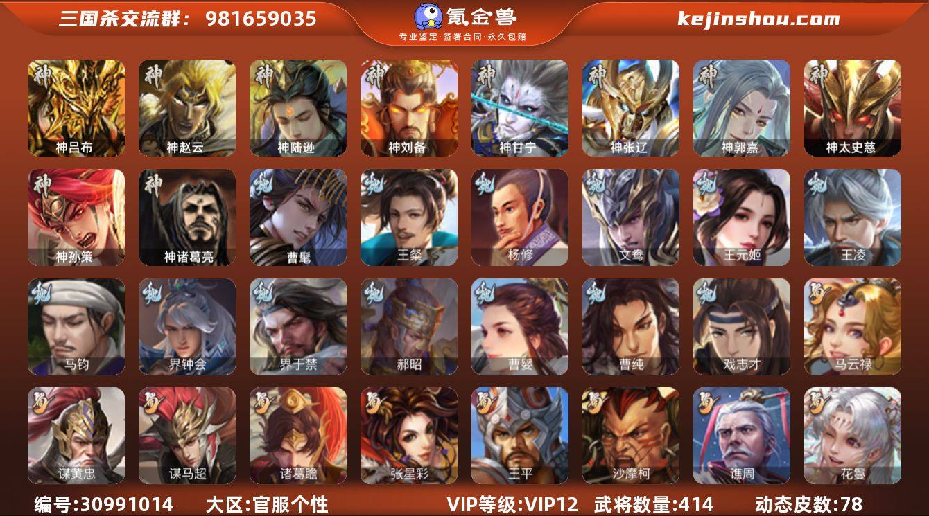 VIP等级: VIP12 官阶: 大将军 武将数量: 380 动态皮肤数量: 49 神将: 神甘宁,神郭嘉,神陆逊,神吕布,神司马懿,神孙策,神张辽,神赵云,神吕蒙,神周瑜,神鲁肃 魏国武将: 戏志才,曹纯,曹婴,程昱,郝昭,嵇康,界钟会,魏-司马昭,王朗,王元姬,文鸯,杨修,王粲,唐咨-魏,张辽,SP蔡文姬,SP关羽,SP贾诩,SP姜维,SP庞德,卞夫人,蔡贞姬,曹昂,曹操,曹冲,曹洪,曹丕,曹仁,曹叡,曹嵩,王异,张恭,鲁芝,界满宠,曹休,界曹植,满宠,荀攸,钟繇,郭嘉,牵招,荀彧,阮慧,杜畿,界郭嘉,崔琰,界曹丕,界荀彧,朱灵,界甄姬,吕虔,界王异,界许褚,界郭淮,华歆,陈群,界典韦,袁涣,乐进,辛宪英,郭淮,界曹彰,郭皇后,毌丘俭,夏侯惇,曹植,司马朗,谋于禁,界曹操,星周不疑,许褚,界张辽,谋徐晃,张郃,钟会,文聘,曹彰,界夏侯惇,诸葛诞,司马懿,甄姬,界徐晃,徐晃,韩浩史涣,胡班,曹真,典韦,界夏侯渊,夏侯渊,李典,于禁,王双,邓艾,界司马懿,臧霸,牛金,朱灵(国战),曹髦,李昭焦伯,清河公主,SP司马昭,董昭,谋夏侯渊,势辛宪英 蜀国武将: 花鬘,谯周,沙摩柯,诸葛瞻,谋马超,谋赵云,谋黄忠,徐庶,界魏延,杨仪,吕凯,界关羽,界诸葛亮,邓芝,界伊籍,费祎,界黄月英,界张嶷,赵云,张松,彭羕,李丰,界刘备,谋姜维,刘封,糜竺,谋庞统,黄月英,关羽,吴懿,吴班,祝融,张飞,黄皓,陈震,魏延,马忠,界法正,糜夫人,界孟获,刘禅,界赵云,谋诸葛亮,张翼,关银屏,界祝融,SP孙尚香,SP徐庶,卧龙诸葛,周仓,简雍,界关兴张苞,诸葛亮,界张飞,界卧龙诸葛,法正,赵统赵广,陈到,界马岱,关平,马岱,界庞统,庞统,诸葛果,谋张飞,马谡,马超,霍峻,廖化,关兴张苞,谋关羽,孟获,夏侯氏,姜维,黄忠,刘备,界马超,李严,马良,傅肜,蒋琬费祎,刘谌,彭羕(国战),甘夫人,蜀-糜芳傅士仁,SP甘夫人 吴国武将: 界徐盛,留赞,骆统,孙寒华,孙皓,文鸯,潘濬,周泰,全琮,吕蒙,诸葛恪,界孙尚香,界顾雍,大乔小乔,桥公,谋周瑜,许贡,丁奉,谋吕蒙,孙茹,蒋钦,顾雍...