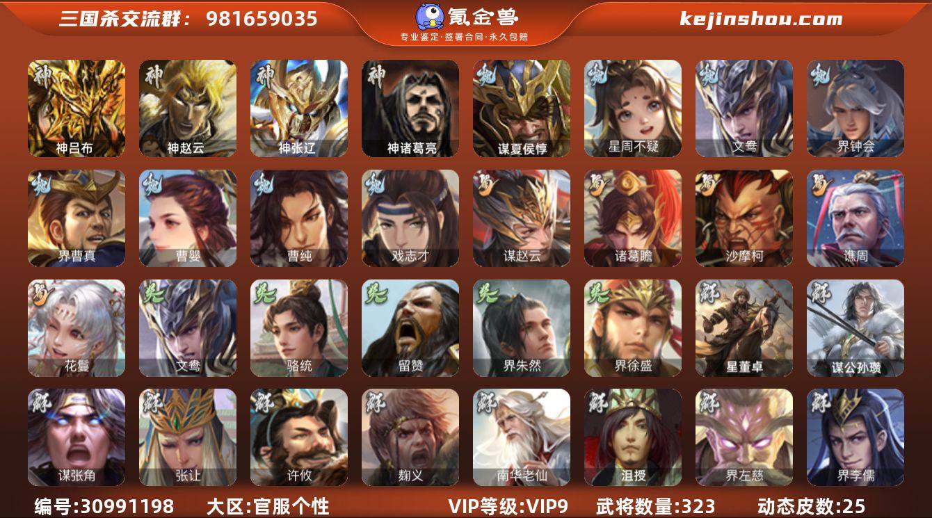 官阶:骠骑将军;VIP等级:VIP9;史诗武将数量:35;动态皮肤数量:25;武将总数:323;史诗宝珠数量:0;将魂数量:72;神将:7;魏国史诗武将:24;蜀国史诗武将:5;吴国史诗武将:4;群史诗武将:14 神吕布,神赵云,神张辽,神关羽,神吕蒙,神周瑜,神诸葛亮,星周不疑,文鸯,魏-司马昭,界钟会,界曹真,曹婴,曹纯,戏志才,谋夏侯惇,谋赵云,诸葛瞻,沙摩柯,谯周,花鬘,骆统,留赞,界朱然,界徐盛,谋公孙瓒,张让,麹义,南华老仙,沮授,界左慈,界李儒,公孙康,卑弥呼,谋张角,张绣,李傕,许攸,星董卓,神太史慈-勇撼日月(动态),神张辽-散敌擒孙,神周瑜-波澜不惊,星周不疑-才广志宏(动态),钟会-龙年端午(动态),曹植-龙年中秋(动态),钟会-潜蛟觊天(动态),甄姬-明珠耀躯(动态),曹丕-龙年中秋(动态),曹昂-竭战麟伤(动态),曹婴-兔年春节(动态),王元姬-鼠年冬至(动态),司马昭-昭威淮南(动态),星徐晃-斧引霹雳(动态),清河公主-魅影萦心(动态),关索-虎年七夕(动态),鲍三娘-虎年七夕(动态),卧龙诸葛-火烧博望(动态),吕蒙-剑起惊澜(动态),陆逊-龙年七夕(动态),孙权-猪年端午(动态),界孙权-猪年端午(动态),刘赞-灵魂歌王(动态),文鸯-势若万钧(动态),麹义-扬刀立威(动态),SP赵云-威名尽显(动态),左慈-蛇年限定(动态)
