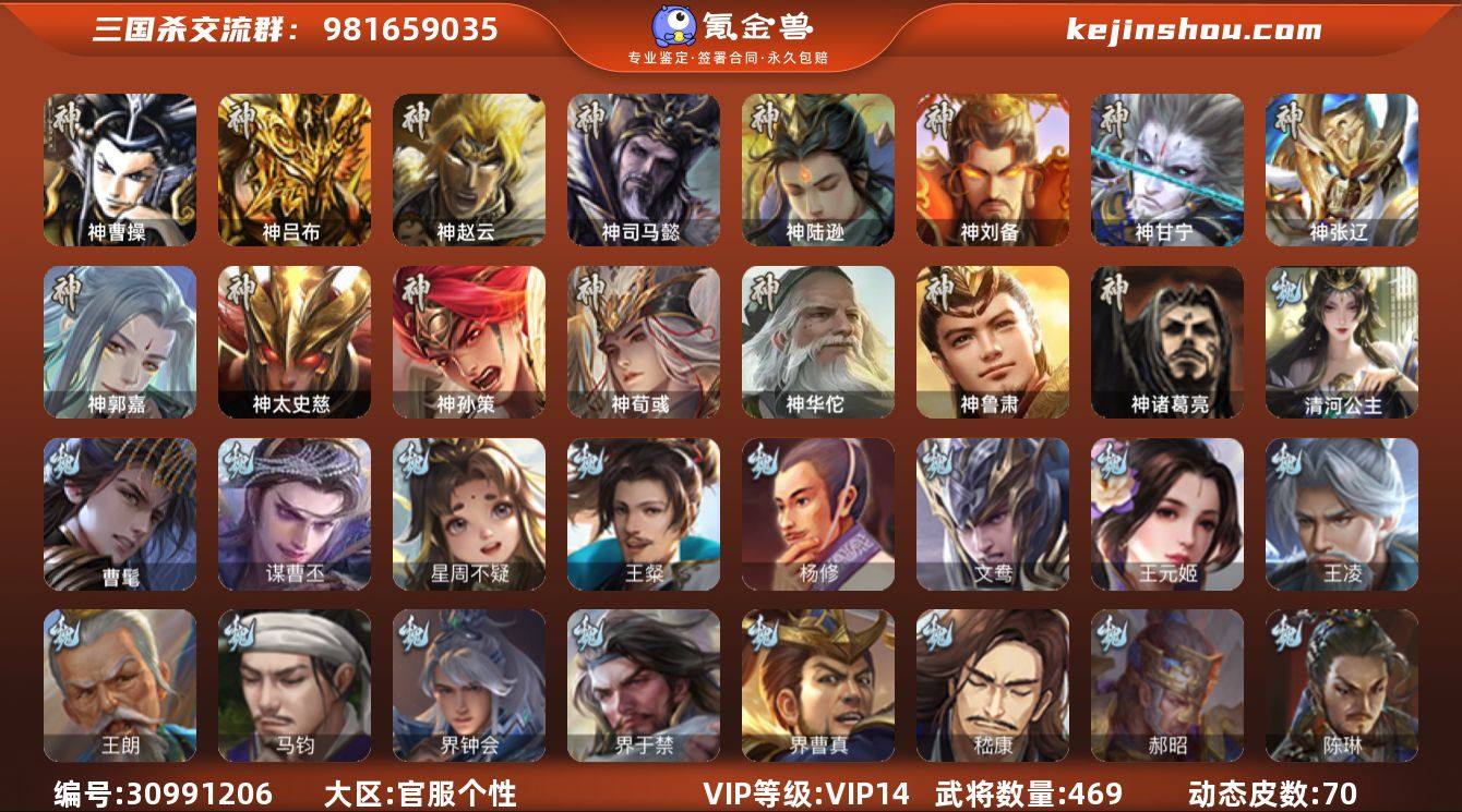 官阶:大将军;VIP等级:VIP14;史诗武将数量:95;动态皮肤数量:70;武将总数:469;史诗宝珠数量:21;将魂数量:21576;神将:18;魏国史诗武将:47;蜀国史诗武将:17;吴国史诗武将:14;群史诗武将:32