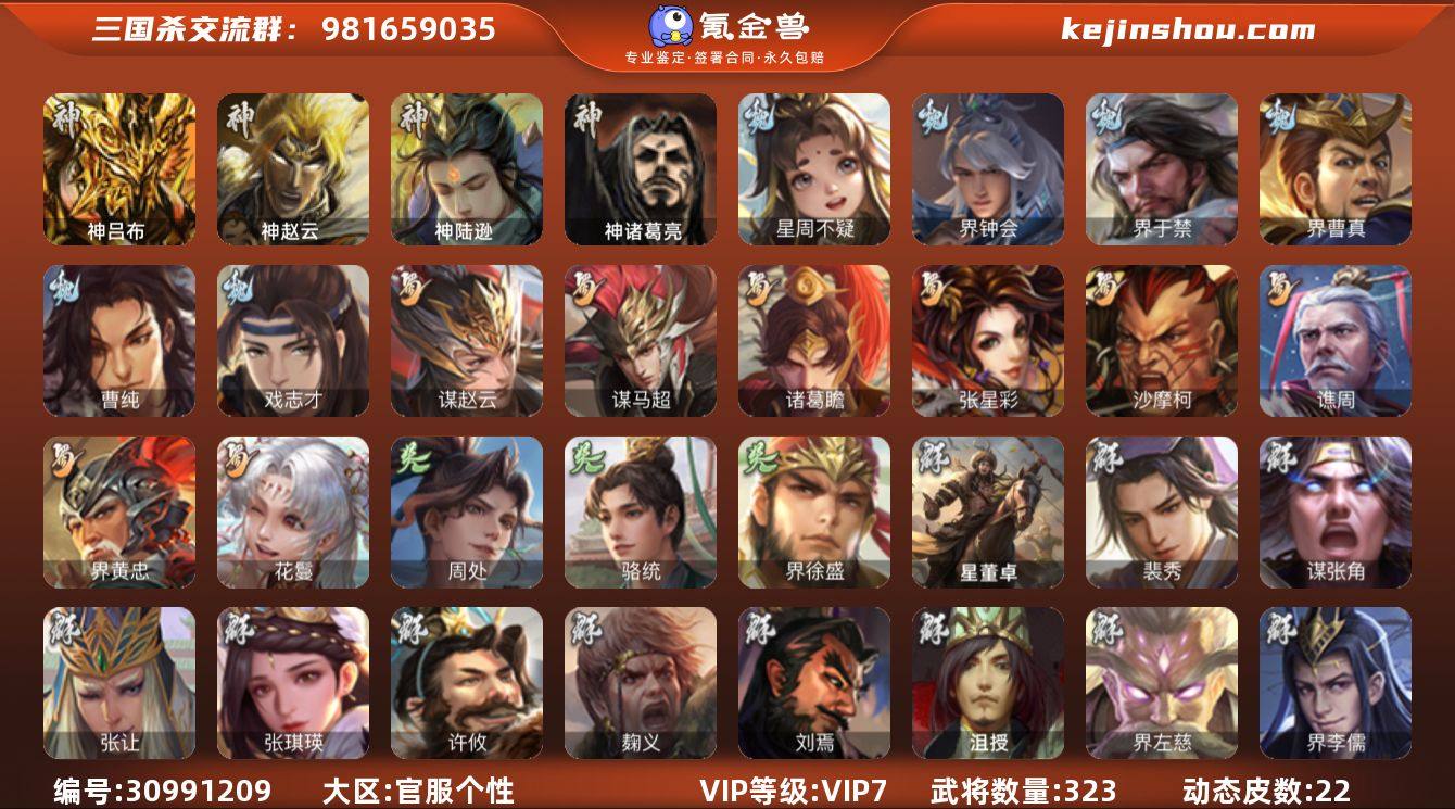 官阶:骠骑将军;VIP等级:VIP7;史诗武将数量:34;动态皮肤数量:22;武将总数:323;史诗宝珠数量:24;将魂数量:11421;神将:4;魏国史诗武将:8;蜀国史诗武将:8;吴国史诗武将:3;群史诗武将:15 神吕布,神赵云,神陆逊,神诸葛亮,星周不疑,界钟会,界于禁,界曹真,曹纯,戏志才,谋赵云,谋马超,诸葛瞻,张星彩,沙摩柯,谯周,界黄忠,花鬘,周处,骆统,界徐盛,谋郭嘉,裴秀,张让,张琪瑛,麹义,刘焉,沮授,界左慈,界李儒,公孙康,谋张角,张绣,李傕,许攸,星董卓,神张辽-散敌擒孙,神吕布-监兵噬魅(动态),SP蔡文姬-兔年冬日(动态),戏志才-举棋若定(动态),司马懿-重张区宇(动态),诸葛诞-寿春举义(动态),孟获-祸崇南疆(动态),费祎-安民护祚(动态),鲍三娘-虎年七夕(动态),周处-义除三害(动态),周瑜-兔年七夕(动态),徐盛-破军杀将(动态),刘赞-灵魂歌王(动态),高顺-每战必克(动态),高览-威显官渡(动态),麹义-扬刀立威(动态),张角-黄天当立(动态),左慈-役使鬼神(动态),李儒-鸠杀少帝(动态),界李儒-鸠杀少帝(动态),张宝-苍天已死(动态),SP貂蝉-驭魂千机(动态),刘焉-雄踞益州(动态),左慈-蛇年限定(动态)
