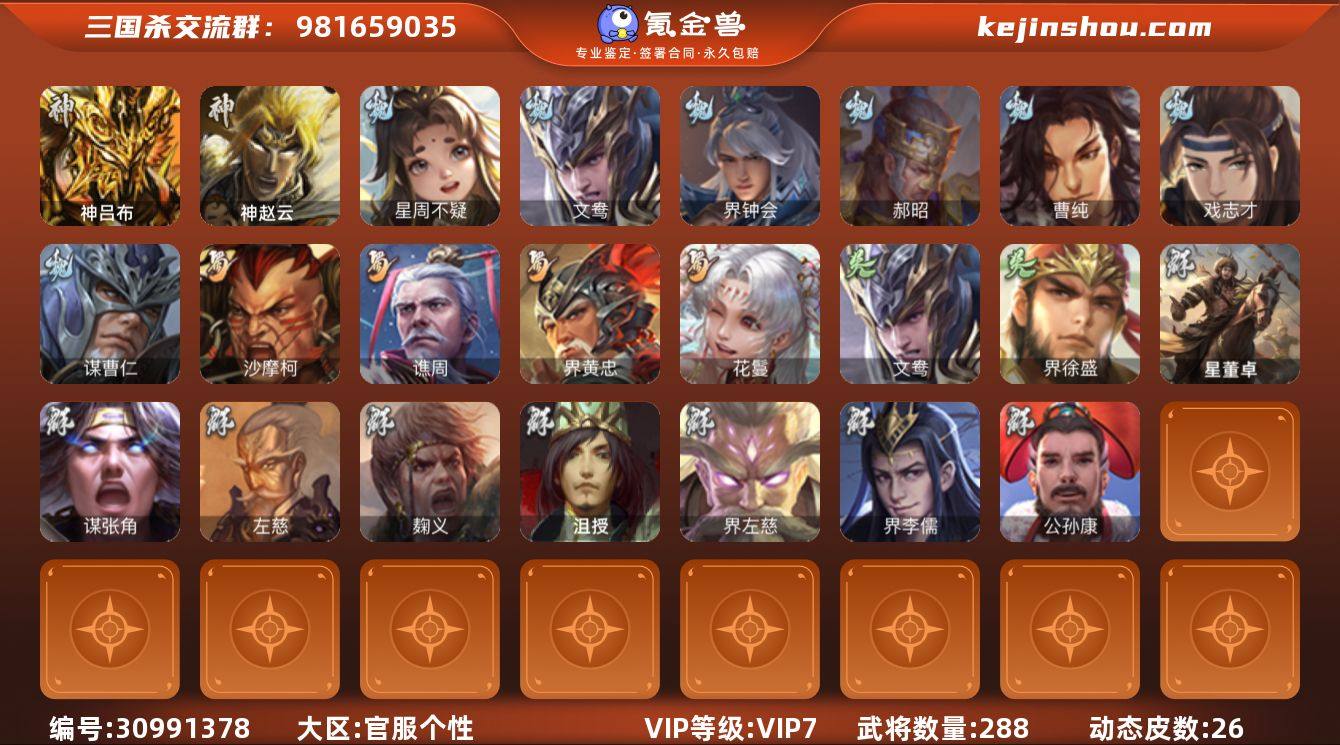 官阶:骠骑将军;VIP等级:VIP7;史诗武将数量:30;动态皮肤数量:19;武将总数:313;史诗宝珠数量:3;将魂数量:888;神将:0;魏国史诗武将:8;蜀国史诗武将:8;吴国史诗武将:3;群史诗武将:9 星周不疑,杨修,王元姬,界钟会,界曹真,嵇康,陈琳,曹纯,戏志才,程昱,关索,马云騄,谋马超,诸葛瞻,张星彩,沙摩柯,董允,谋关羽,界朱然,界徐盛,势太史慈,左慈,审配,麹义,南华老仙,沮授,界左慈,界李儒,友诸葛亮,兀突骨,神吕蒙,神周瑜,势夏侯尚,SP关羽,SP曹仁,SP蔡文姬,乐进,曹昂,诸葛诞,朱灵,文聘,SP姜维,钟会,曹冲,郭淮,满宠,界王异,界曹操,界司马懿,界夏侯惇,界张辽,界郭嘉,李典,曹真,韩浩史涣,陈群,曹叡,曹休,钟繇,司马朗,李通,郭皇后,孙资刘放,辛宪英,界甄姬,吕虔,鲁芝,界荀彧,界徐晃,杜畿,界邓艾,张恭,界曹植,界曹彰,界郭淮,卞夫人,华歆,蔡贞姬,袁涣,崔琰,杨阜,阮慧,谋徐晃,胡班,谋郭嘉,谋夏侯渊,界夏侯渊,董昭,势陈到,SP孙尚香,关银屏,夏侯霸,马良,关兴张苞,廖化,界马岱,关平,简雍,刘封,界法正,界关兴张苞,界刘备,界关羽,界张飞,界马超,SP徐庶,吴懿,周仓,张松,刘谌,夏侯氏,糜竺,马忠,界黄月英,界诸葛亮,赵统赵广,界伊籍,界庞统,界祝融,界姜维,界刘禅,胡金定,张翼,杨仪,邓芝,傅肜,陈震,费祎,糜夫人,界周仓,谋庞统,界张嶷,谋姜维,谋张飞,吴班,李遗,霍峻,诸葛果,界魏延,蒋琬费祎,糜芳傅士仁,甘夫人,势陈祗,鲁肃,凌操,诸葛恪,诸葛瑾,孙鲁育,程普,韩当,潘璋马忠,虞翻,朱然,界甘宁,界黄盖,界周瑜,界大乔,界陆逊,孙鲁班,朱桓,顾雍,全琮,步骘,界孙权,界孙尚香,潘濬,孙亮,吕岱,周妃,界张昭张纮,卫温诸葛直,界凌统,界程普,界虞翻,孙邵,陈武董袭,孙翊,蒋钦,吕范,濮阳兴,谋韩当,谋吕蒙,谋周瑜,界朱治,谋小乔,界小乔,友徐庶,伏完,刘协,界袁术,SP赵云,张宝,伏皇后,李儒,界张角,华雄,袁术,界华佗,界吕布,公孙瓒,蔡夫人,公孙渊,郭图逢纪,张鲁,...