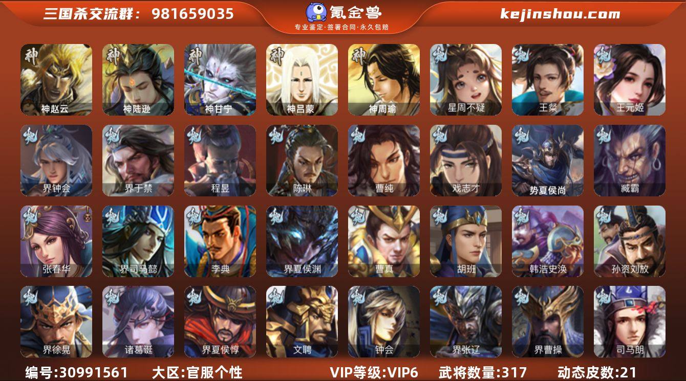 官阶:骠骑将军;VIP等级:VIP6;史诗武将数量:29;动态皮肤数量:21;武将总数:317;史诗宝珠数量:52;将魂数量:7348;神将:3;魏国史诗武将:12;蜀国史诗武将:6;吴国史诗武将:4;群史诗武将:7 神赵云,神陆逊,神甘宁,星周不疑,王粲,王元姬,界钟会,界于禁,陈琳,曹纯,戏志才,程昱,谋诸葛亮,谋赵云,谋马超,沙摩柯,谯周,花鬘,吴景,界朱然,界徐盛,贺齐,界沮授,左慈,麹义,庞德公,沮授,兀突骨,士燮,神吕蒙,神周瑜,势夏侯尚,SP关羽,SP蔡文姬,乐进,曹昂,诸葛诞,朱灵,文聘,SP姜维,张春华,钟会,曹冲,郭淮,满宠,界王异,界曹操,界司马懿,界夏侯惇,界张辽,界许褚,界郭嘉,李典,曹真,韩浩史涣,陈群,曹叡,曹休,钟繇,司马朗,王基,郭皇后,孙资刘放,辛宪英,界甄姬,吕虔,界徐晃,杜畿,界曹丕,张恭,界曹植,界满宠,界郭淮,华歆,袁涣,崔琰,毛玠,谋徐晃,谋于禁,界曹休,胡班,文钦,界夏侯渊,臧霸,唐咨,SP孙尚香,关银屏,夏侯霸,马良,关兴张苞,廖化,界马岱,关平,简雍,刘封,界法正,界关兴张苞,界刘备,界关羽,界张飞,界赵云,SP徐庶,吴懿,周仓,张松,刘谌,夏侯氏,糜竺,马忠,李严,黄皓,界黄月英,严颜,界伊籍,界庞统,界刘禅,吕凯,张翼,杨仪,邓芝,傅肜,界简雍,费祎,糜夫人,王甫赵累,向宠,彭羕,界张嶷,谋张飞,诸葛果,界魏延,蒋琬费祎,甘夫人,势陈祗,凌操,大乔小乔,诸葛恪,诸葛瑾,孙鲁育,程普,韩当,潘璋马忠,虞翻,朱然,界甘宁,界吕蒙,界黄盖,界周瑜,界大乔,界陆逊,孙鲁班,朱桓,顾雍,孙休,朱治,全琮,孙登,界孙权,潘濬,孙亮,吕岱,界张昭张纮,许贡,卫温诸葛直,界吴国太,界韩当,界程普,界虞翻,界潘璋马忠,孙邵,桥公,张温,陈武董袭,蒋钦,吕范,界孙鲁班,濮阳兴,谋韩当,谋吕蒙,界朱治,谋小乔,友徐庶,友庞统,伏完,刘协,界袁术,SP赵云,SP貂蝉,张宝,伏皇后,李儒,华雄,袁术,界华佗,界吕布,公孙瓒,蔡夫人,公孙渊,郭图逢纪,张鲁,蹋顿,严白虎,SP黄月英,刘虞,曹节,蔡邕,界...