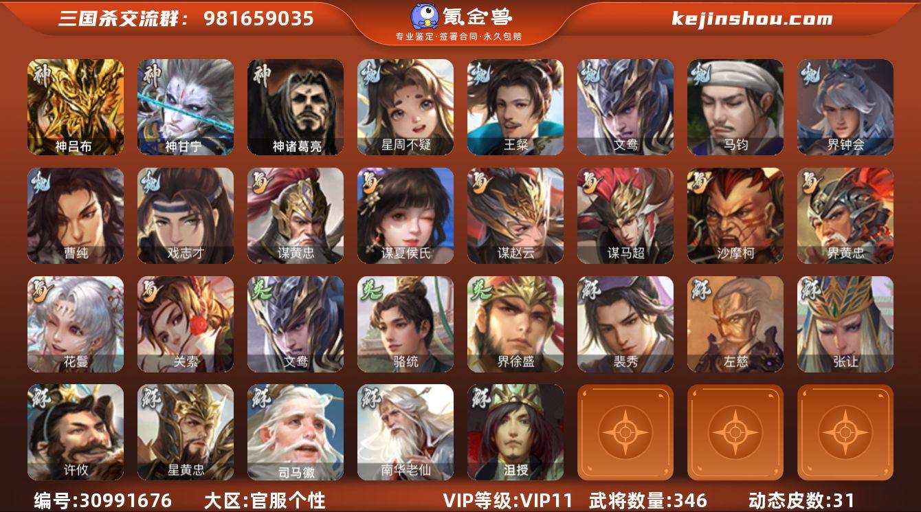 官阶:大将军;VIP等级:VIP11;史诗武将数量:30;动态皮肤数量:31;武将总数:346;史诗宝珠数量:0;将魂数量:487;神将:6;魏国史诗武将:10;蜀国史诗武将:8;吴国史诗武将:2;群史诗武将:10 神吕布,神甘宁,神关羽,神吕蒙,神周瑜,神诸葛亮,星周不疑,王粲,文鸯,魏-司马昭,马钧,界钟会,曹纯,戏志才,关索,谋黄忠,谋夏侯氏,谋赵云,谋马超,沙摩柯,界黄忠,花鬘,骆统,界徐盛,裴秀,左慈,张让,星黄忠,司马徽,南华老仙,沮授,张绣,李傕,许攸,神甘宁-万人辟易(动态),星周不疑-才广志宏(动态),曹叡-睥睨天下(动态),马钧-能工巧匠(动态),司马昭-昭威淮南(动态),星徐晃-斧引霹雳(动态),诸葛亮-龙年限定(动态),卧龙诸葛-龙跃凤鸣(动态),黄忠-明良千古(动态),诸葛果-虎年中秋(动态),诸葛果-蛇年限定(动态),太史慈-涤荡江东(动态),周处-义除三害(动态),孙策-虎踞江东(动态),周瑜-鼠年春节(动态),界周瑜-鼠年春节(动态),徐盛-破军杀将(动态),陆逊-蛇年清明(动态),文鸯-势若万钧(动态),麹义-扬刀立威(动态),左慈-蛇年限定(动态)