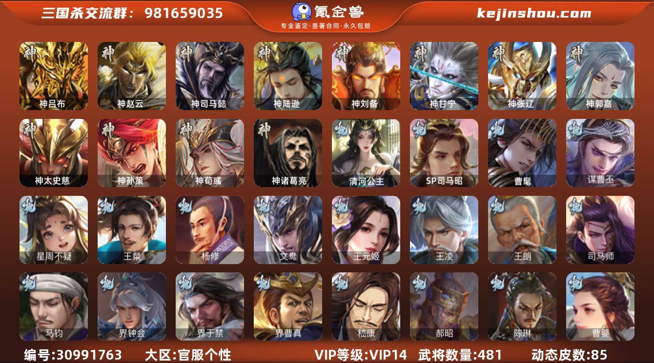 官阶:大将军;VIP等级:VIP14;史诗武将数量:88;动态皮肤数量:85;武将总数:481;史诗宝珠数量:0;将魂数量:54;神将:15;魏国史诗武将:65;蜀国史诗武将:15;吴国史诗武将:11;群史诗武将:29 神吕布,神赵云,神司马懿,神陆逊,神刘备,神甘宁,神张辽,神郭嘉,神太史慈,神孙策,神荀彧,神关羽,神吕蒙,神周瑜,神诸葛亮,SP司马昭,曹髦,星周不疑,王粲,杨修,文鸯,王元姬,王凌,王朗,魏-司马昭,司马师,马钧,界钟会,界于禁,界曹真,嵇康,郝昭,陈琳,曹婴,曹纯,戏志才,刘晔,谋曹丕,清河公主,关索,马云騄,谋黄忠,谋赵云,谋马超,诸葛瞻,赵襄,张星彩,王平,沙摩柯,谯周,界黄忠,花鬘,董允,鲍三娘,谋陆逊,周处,吴景,孙皓,骆统,留赞,界朱然,界徐盛,界步练师,贺齐,势太史慈,界沮授,左慈,郑玄,张让,张琪瑛,星甘宁,王允,陶谦,苏飞,司马徽,审配,麹义,祢衡,刘焉,沮授,界左慈,界李儒,公孙康,杜预,卑弥呼,鲍信,谋张角,张绣,李傕,阎象,许攸,势于吉,友徐庶,星董卓,神郭嘉-虎年清明(动态),神郭嘉-倚星折月(动态),神太史慈-勇撼日月(动态),神荀彧-虎年清明(动态),神荀彧-匡汉延祚(动态),神张辽-散敌擒孙,神陆逊-绽焰摧枯(动态),神关羽-血海罗刹(动态),神周瑜-陵光引灵(动态),神曹操-天下归心,神吕布-监兵噬魅(动态),神赵云-战龙在野(动态),神司马懿-鉴往知来(动态),鲍三娘-情定缘起,星周不疑-才广志宏(动态),曹丕-气荡山河(动态),SP蔡文姬-兔年冬日(动态),曹冲-五陵英少(动态),司马懿-牛年立冬(动态),郭嘉-十胜十败(动态),曹丕-猪年端午(动态),邓艾-神兵天降(动态),王粲-笔翰如流(动态),界司马懿-牛年立冬(动态),界郭嘉-十胜十败(动态),界曹丕-猪年端午(动态),界邓艾-神兵天降(动态),张春华-宣穆夜袭(动态),王异-轻燕掠影(动态),钟会-谋谟之勋(动态),界曹植-鼠年端午(动态),界王异-轻燕掠影(动态),界钟会-谋谟之勋(动态),辛宪英-鼠年春节(动态),曹...