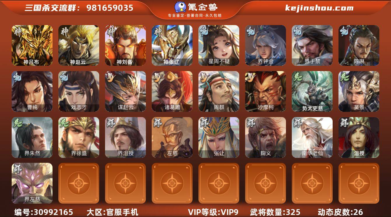 官阶:骠骑将军;VIP等级:VIP8;史诗武将数量:29;动态皮肤数量:17;武将总数:294;史诗宝珠数量:2;将魂数量:4138;神将:5;魏国史诗武将:7;蜀国史诗武将:5;吴国史诗武将:7;群史诗武将:8 神吕布,神赵云,神陆逊,神张辽,神太史慈,星周不疑,王元姬,曹纯,戏志才,程昱,谋赵云,谋马超,谯周,界黄忠,花鬘,谋陆逊,骆统,界朱然,界徐盛,势陆郁生,文鸯,左慈,审配,麹义,沮授,界李儒,谋张角,谋吕布,兀突骨,神吕蒙,神周瑜,势夏侯尚,SP关羽,SP曹仁,乐进,曹昂,诸葛诞,朱灵,文聘,SP姜维,钟会,曹冲,郭淮,满宠,界王异,界曹操,界司马懿,界夏侯惇,界张辽,界许褚,界郭嘉,李典,曹真,韩浩史涣,陈群,曹叡,曹休,钟繇,司马朗,李通,郭皇后,辛宪英,吕虔,鲁芝,界徐晃,杜畿,界曹植,界郭淮,卞夫人,蔡贞姬,袁涣,王双,崔琰,阮慧,谋徐晃,界曹休,胡班,司马伷,谋张辽,牛金,臧霸,SP孙尚香,关银屏,夏侯霸,马良,关兴张苞,廖化,界马岱,关平,简雍,刘封,界法正,界关兴张苞,界刘备,界关羽,界张飞,SP徐庶,吴懿,周仓,张松,刘谌,夏侯氏,马忠,黄皓,界黄月英,界诸葛亮,界伊籍,界庞统,界刘禅,张翼,杨仪,邓芝,界简雍,费祎,糜夫人,彭羕,谋庞统,界张嶷,谋姜维,谋张飞,谋祝融,诸葛果,蒋琬费祎,甘夫人,凌操,诸葛恪,诸葛瑾,孙鲁育,程普,韩当,潘璋马忠,虞翻,朱然,界甘宁,界黄盖,界周瑜,界大乔,界陆逊,孙鲁班,朱桓,顾雍,孙休,朱治,孙登,界孙权,界孙尚香,潘濬,严畯,吕岱,卫温诸葛直,界吴国太,陈武董袭,蒋钦,吕范,界孙鲁班,濮阳兴,谋韩当,谋吕蒙,谋周瑜,界全琮,界朱治,谋小乔,张布,界小乔,友庞统,伏完,刘协,界袁术,SP赵云,张宝,伏皇后,李儒,华雄,袁术,界华佗,界吕布,公孙瓒,蔡夫人,公孙渊,郭图逢纪,张鲁,蹋顿,严白虎,SP黄月英,曹节,蔡邕,界貂蝉,SP太史慈,刘琦,界庞德,界颜良文丑,张济,樊稠,刘繇,董承,界刘表,星张辽,星张郃,界公孙瓒,胡车儿,羊祜,界蔡夫人,谋刘赪,王濬,谋陈宫,...