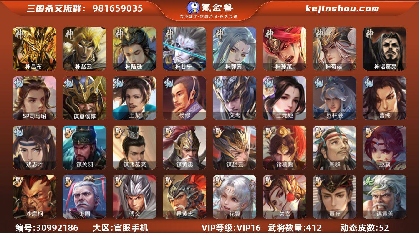官阶:大将军;VIP等级:VIP16;史诗武将数量:63;动态皮肤数量:52;武将总数:412;史诗宝珠数量:5;将魂数量:191;神将:10;魏国史诗武将:27;蜀国史诗武将:14;吴国史诗武将:9;群史诗武将:29 神吕布,神赵云,神陆逊,神甘宁,神郭嘉,神孙策,神荀彧,神吕蒙,神周瑜,神诸葛亮,SP司马昭,王粲,杨修,文鸯,王元姬,魏-司马昭,界钟会,曹纯,戏志才,谋夏侯惇,关索,谋诸葛亮,谋黄忠,谋赵云,诸葛瞻,周群,赵襄,沙摩柯,谯周,傅佥,界黄忠,花鬘,董允,谋关羽,谋黄盖,谋孙策,周处,吴景,孙皓,孙寒华,骆统,留赞,界徐盛,谋郭嘉,谋黄月英,谋荀彧,十常侍,谋貂蝉,裴秀,界沮授,左慈,张让,杨彪,徐荣,星甘宁,苏飞,麹义,南华老仙,祢衡,刘焉,沮授,界左慈,界李儒,公孙康,杜预,鲍信,谋张角,张绣,李傕,阎象,许攸,陈珪,神张辽-威震江东,神郭嘉-倚星折月(动态),神孙策-霸王再世(动态),神荀彧-虎年清明(动态),神荀彧-匡汉延祚(动态),神刘备-龙兴海内,神甘宁-万人辟易(动态),神周瑜-焰腾麒麟(动态),神曹操-天下归心,神吕布-监兵噬魅(动态),神赵云-战龙在野(动态),曹植-龙年中秋(动态),曹丕-气荡山河(动态),星周不疑-龙年清明(动态),甄姬-明珠耀躯(动态),许褚-兔年端午(动态),邓艾-神兵天降(动态),界邓艾-神兵天降(动态),张春华-雪中舞刃(动态),钟会-谋谟之勋(动态),界钟会-谋谟之勋(动态),曹昂-竭战麟伤(动态),戏志才-举棋若定(动态),朱灵-以战破氐(动态),曹纯-虎年春节(动态),司马昭-昭威淮南(动态),花鬘-依心缱绻(动态),诸葛亮-龙年限定(动态),诸葛亮-国之柱石(动态),费祎-安民护祚(动态),沙摩柯-劲弩始发(动态),关羽-明良千古(动态),黄月英-木牛流马(动态),黄忠-明良千古(动态),诸葛瞻-绵竹之殇(动态),界黄月英-木牛流马(动态),关索-虎年七夕(动态),卧龙诸葛-火烧博望(动态),太史慈-涤荡江东(动态),周处-义除三害(动态),孙权-永开吴祚(动态),...
