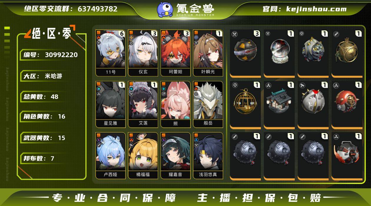 冒险等级:60 总黄数:48 菲林底片数量:0 菲林数量:269 加密母带数量:0 五星角色数:16 6命「11号」,3命仪玄,3命珂蕾妲,1命叶瞬光,1命星见雅,1命艾莲,0命照,0命般岳,0命卢西娅,0命橘福福,0命耀嘉音,0命浅羽悠真,0命月城柳,0命青衣,0命丽娜,0命猫又 五星武器数:15 3精硫磺石,1精云霓孤光,1精怒目金刚,1精铸梦炉歌,1精青溟笼舍,1精霰落星殿,1精焰心桂冠,1精灼心摇壶,1精啜泣摇篮,1精嵌合编译器,1精深海访客 邦布数量:7 5精比克布利克,5精艾丝弥小姐,5精狮耶,5精咔嚓仔,5精格列佛探员,5精鲨牙布,5精巴特勒 白心旧影,狡黠甜心,晴澜双迹套装,漪光夜曲 卖家说:比较欧