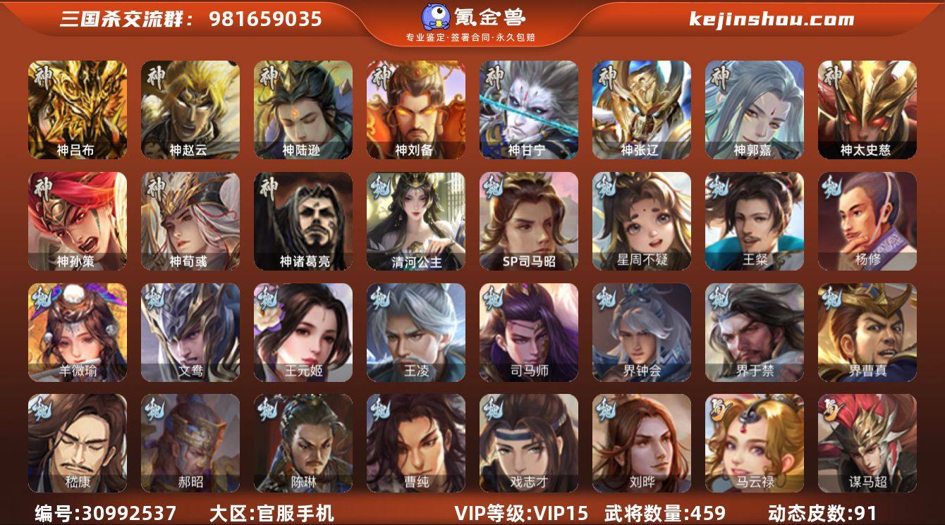 官阶:大将军;VIP等级:VIP15;史诗武将数量:80;动态皮肤数量:91;武将总数:459;史诗宝珠数量:9;将魂数量:6345;神将:14;魏国史诗武将:37;蜀国史诗武将:13;吴国史诗武将:10;群史诗武将:26 神吕布,神赵云,神陆逊,神刘备,神甘宁,神张辽,神郭嘉,神太史慈,神孙策,神荀彧,神关羽,神吕蒙,神周瑜,神诸葛亮,SP司马昭,星周不疑,王粲,杨修,羊徽瑜,文鸯,王元姬,王凌,魏-司马昭,司马师,界钟会,界于禁,界曹真,嵇康,郝昭,陈琳,曹纯,戏志才,刘晔,清河公主,关索,马云騄,谋马超,诸葛瞻,周群,赵襄,张星彩,王平,沙摩柯,谯周,界黄忠,花鬘,董允,周处,吴景,孙皓,骆统,留赞,界朱然,界徐盛,界步练师,贺齐,势太史慈,裴秀,左慈,张仲景,张让,张琪瑛,杨彪,徐荣,星黄忠,星甘宁,陶谦,苏飞,审配,麹义,南华老仙,祢衡,刘璋,沮授,界左慈,界李儒,公孙康,杜预,张绣,李傕,许攸,谋吕布,星董卓,神鲁肃-九州为局,神郭嘉-虎年清明(动态),神郭嘉-倚星折月(动态),神孙策-霸王再世(动态),神荀彧-虎年清明(动态),神荀彧-匡汉延祚(动态),神吕蒙-心生万象,神甘宁-万人辟易(动态),神陆逊-绽焰摧枯(动态),神周瑜-焰腾麒麟(动态),神赵云-战龙在野(动态),曹丕-龙年中秋(动态),SP蔡文姬-兔年冬日(动态),许褚-虎啸生风(动态),张辽-登峰陷阵(动态),邓艾-神兵天降(动态),王粲-笔翰如流(动态),界张辽-登峰陷阵(动态),界许褚-虎啸生风(动态),界邓艾-神兵天降(动态),钟会-谋谟之勋(动态),界钟会-谋谟之勋(动态),曹昂-竭战麟伤(动态),朱灵-以战破氐(动态),曹纯-虎年春节(动态),王元姬-鼠年冬至(动态),羊徽瑜-牛年中秋(动态),司马师-牛年中秋(动态),司马昭-昭威淮南(动态),星徐晃-斧引霹雳(动态),清河公主-魅影萦心(动态),刘备-龙御天下(动态),关羽-啸风从龙(动态),马超-星夜袭曹(动态),张飞-据水断桥(动态),黄月英-虎年中秋(动态),诸葛亮-明良千古(动态),界关羽-啸风从...