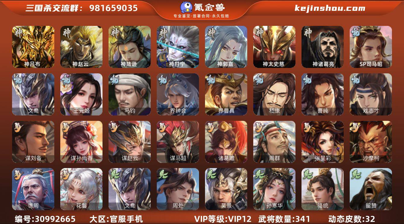 官阶:大将军;VIP等级:VIP12;史诗武将数量:48;动态皮肤数量:32;武将总数:341;史诗宝珠数量:25;将魂数量:4038;神将:9;魏国史诗武将:12;蜀国史诗武将:11;吴国史诗武将:8;群史诗武将:15 神吕布,神赵云,神陆逊,神甘宁,神郭嘉,神太史慈,神吕蒙,神周瑜,神诸葛亮,SP司马昭,文鸯,王元姬,马钧,界钟会,界曹真,嵇康,曹纯,戏志才,谋刘备,谋孙尚香,谋赵云,谋马超,诸葛瞻,周群,张星彩,沙摩柯,谯周,花鬘,周处,吴景,孙寒华,骆统,留赞,界朱然,界徐盛,界步练师,十常侍,谋貂蝉,左慈,星黄忠,麹义,祢衡,刘璋,刘焉,界左慈,界李儒,公孙康,杜预,谋张角,李傕,阎象,神郭嘉-虎年清明(动态),神荀彧-虎年清明(动态),神甘宁-万人辟易(动态),神赵云-战龙在野(动态),神赵云-神龙天降,甄姬-明珠耀躯(动态),许褚-虎啸生风(动态),界许褚-虎啸生风(动态),界曹植-鼠年端午(动态),戏志才-举棋若定(动态),曹纯-虎年春节(动态),刘备-龙御天下(动态),诸葛亮-龙年限定(动态),关羽-明良千古(动态),诸葛亮-明良千古(动态),界诸葛亮-明良千古(动态),关银屏-虎年端午(动态),关银屏-兔年春节(动态),张星彩-猪年中秋(动态),张星彩-虎年端午(动态),关索-虎年七夕(动态),鲍三娘-虎年七夕(动态),胡金定-明良千古(动态),太史慈-涤荡江东(动态),周处-义除三害(动态),周瑜-免年清明(动态),孙尚香-星流霆击(动态),界孙尚香-星流霆击(动态),徐盛-破军杀将(动态),徐氏-琪花瑶草(动态),孙鲁育-猪年春节(动态),孙鲁育-牛年端午(动态),刘赞-灵魂歌王(动态),文鸯-势若万钧(动态),灵雎-霜刃绚练(动态),貂蝉-舞惑群心(动态),刘协-困龙犹斗(动态),SP貂蝉-驭魂千机(动态),张鲁-虎年冬至(动态),刘焉-雄踞益州(动态),祢衡-击鼓骂曹(动态)