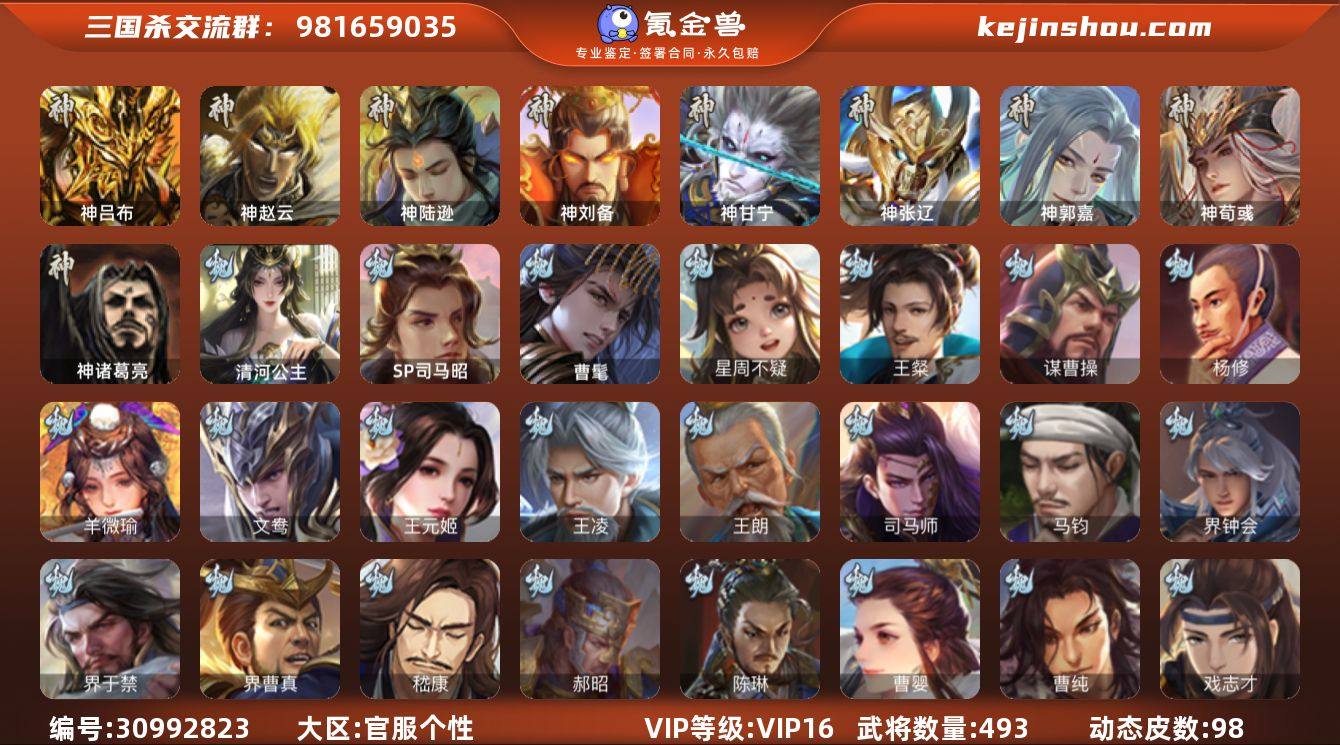 官阶:大将军;VIP等级:VIP16;史诗武将数量:95;动态皮肤数量:98;武将总数:493;史诗宝珠数量:26;将魂数量:50943;神将:11;魏国史诗武将:62;蜀国史诗武将:18;吴国史诗武将:12;群史诗武将:35