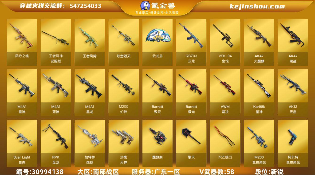 【FC-GJE64K】 四防影煞/四防隼/幻神 星耀 电流/竞技套/星神 音效卡/云龙套手枪*2/炽芒蝶刃/白虎/金蚀/天罚 音效卡/裁决 流光/王者风势/风吟之魄/雷神三件套/极光 音效卡/ 广东一区,等级100,王者武器3,炫金武器2,V武器58, 【英雄角色】传说影煞,华,隼,关小雨,机械姬,星际战将,灵狐者-职业经理,云海玲珑,灵动武士,猎狐者, 【V武器】M200-幻神,M200-竞技荣光,Kar98K-星神,Barrett-毁灭,AWM-裁决,VSK-94-金蚀,Scar Light-白虎,QBZ03-云龙,QBZ03-天罚,RPK-盘龙,加特林-炼狱,柯尔特-竞技荣光,COP 357-云龙,炽芒蝶刃,Barrett-极光,M4A1-雷神,M4A1-黑龙,M4A1-死神,AK47-火麒麟,AK47-黑鲨,AK12-天启,黑武士-锦绣游龙,沙鹰-天神,屠龙,麒麟刺,擎天,擎天-竞技荣光,龙啸-烈火龙威,云龙扇,高爆手雷-竞技荣光,闪光弹-竞技荣光,烟雾弹-竞技荣光,高爆手雷-云龙,闪光弹-云龙,烟雾弹-云龙,手雷-云海游龙,手雷-热带奇洋, 【王者武器】王者风势,王者风神-觉醒版,凤吟之魄,王者风神-觉醒版, 【狙击枪稀有皮肤】幻神-星耀 皮肤,幻神-电流骇客 皮肤,裁决-流光秘银, 【步枪稀有皮肤】雷神-脉冲核心,火麒麟-CFSTAR,火麒麟-暗月,AK47-火麒麟-传奇EVEN,黑骑士-暗月,黑骑士-战神马超, 【近身武器稀有皮肤】屠龙-星火燎原, 【音效道具】Kar98K-星神音效卡,Barrett-极光音效卡,QBZ03-天罚音效卡,M4A1-雷神音效卡, 【小人枪】MK5-炽火炎龙,魔能飞环-曼陀罗,迷你生化手雷,AWM-灵狐-15周年嘉年华,M37-葵,生化手雷-机甲核心,白虎-迷你小艾,迷你地狱终结者,炼狱-秦师, 【武器】火麒麟-雷神,源-黑龙,M4A1-十二生肖·龙-雷神,加特林-炼狱-掌火,魂·炼狱-玩具枪,魂-雷神-萌杀,源·龙啸,源·天神,源·屠龙,源·青龙,源·天龙,源-金色蔷薇,源·天启,源·雷神,源·机械...