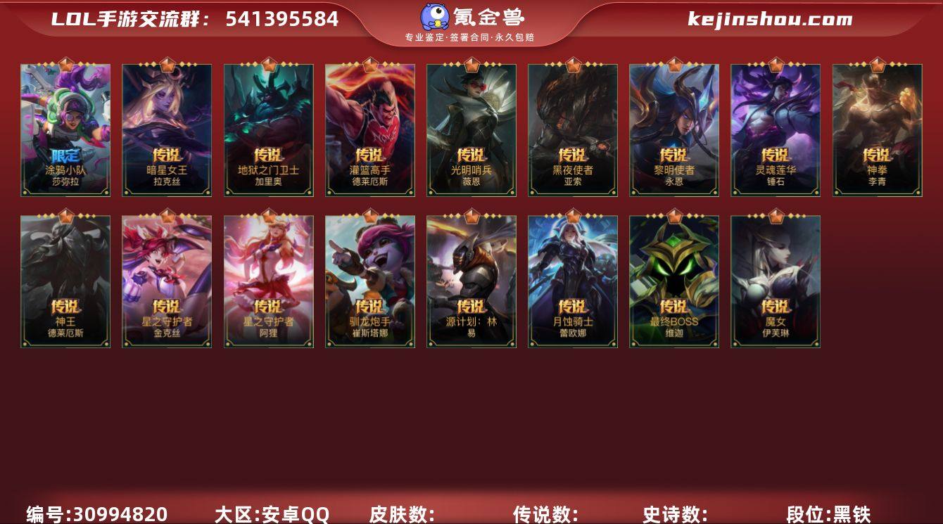 2神话 1限定 19传说 56史诗 128皮肤 可二次 可修改实名 【段位】大师 【神话皮】夜星流火 金克丝,雷霆神兵 沃利贝尔 【限定皮肤】涂鸦小队莎弥拉 【传说皮】御风墨影 亚索,魔女伊芙琳,海魔至尊 亚托克斯,地狱之门卫士,神王诺手,神拳盲僧,黑夜使者亚索,光明哨兵薇恩,灌篮高手,星之守护者金克丝,最终BOSS维迦,暗星女王拉克丝,源计划:林,黎明使者永恩,涂鸦小队莎弥拉,星之守护者阿狸,灵魂莲华锤石,月蚀骑士蕾欧娜,驯龙炮手