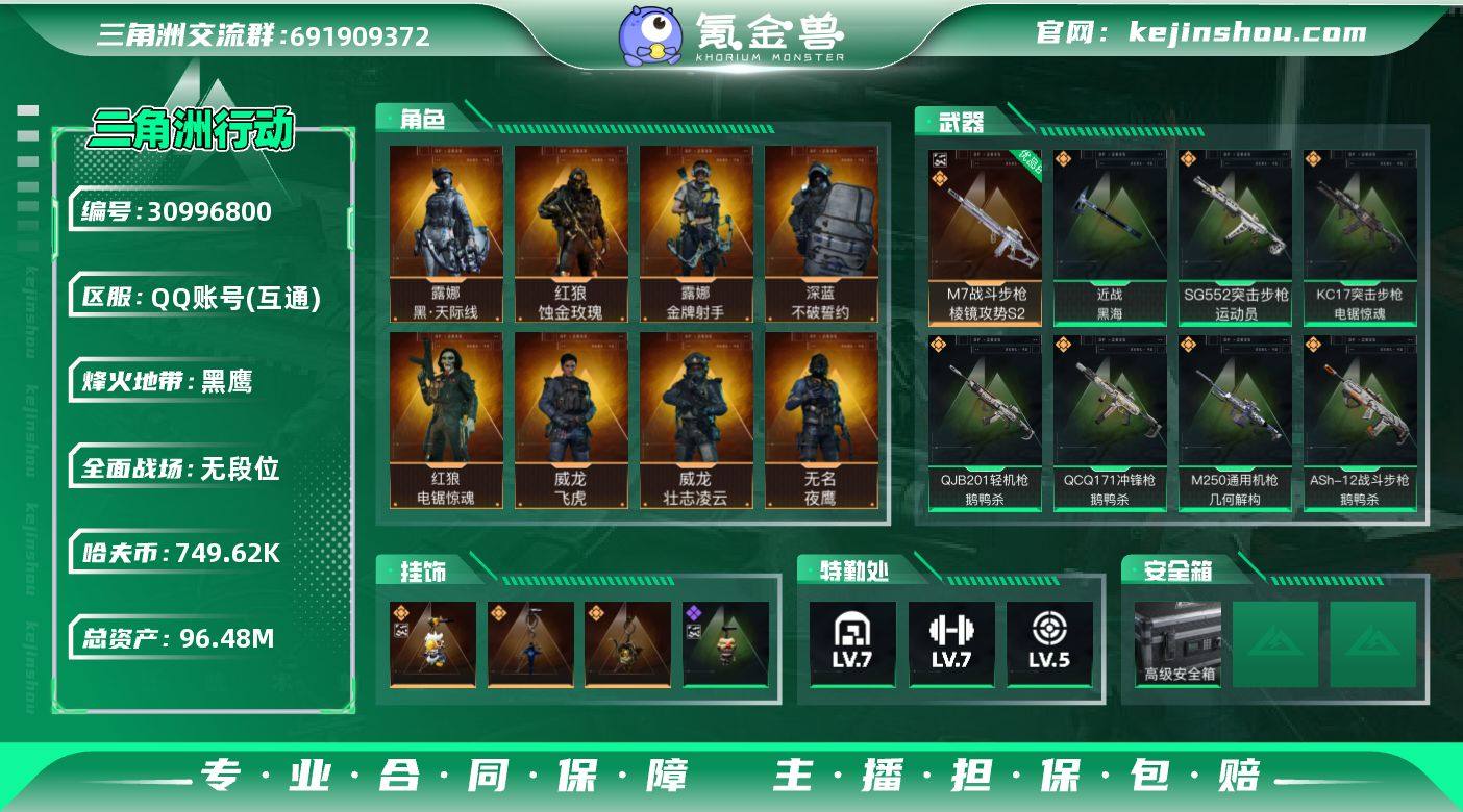 实名:不可二次实名 总资产:96.48M 哈夫币:749.62K S7高级安全箱(2x3) 烽火地带段位:黑鹰 烽火地带等级:60 全面战场段位:无段位 全面战场等级:12 7级仓库,7级训练中心,5级靶场,0级潜水中心,1级收藏室