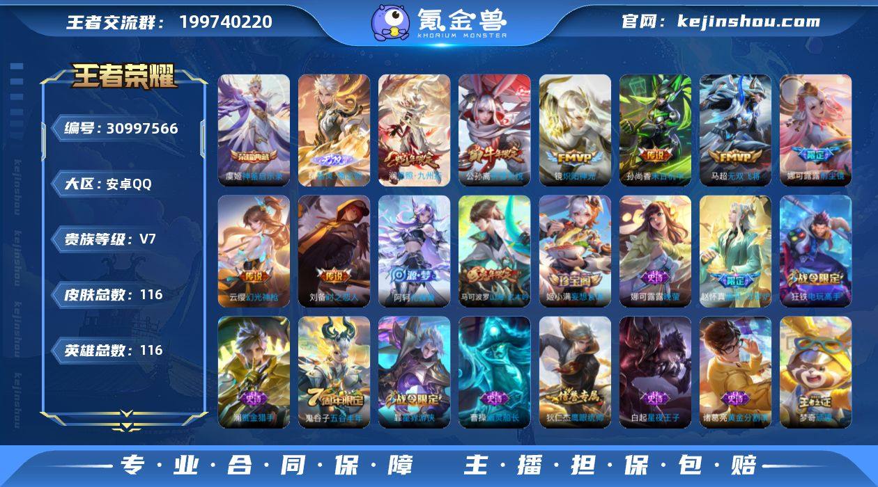 安卓Q-V7-尊贵铂金III段位-116英雄-116皮肤-1典藏皮肤-1无双-9传说-33史诗 【英雄全皮】:娜可露露全皮,影全皮 【荣耀典藏】:虞姬神鉴启示录 【无双皮肤】:曜器灵螭龙剑 【传说皮肤】:后羿神树通天,澜愿照九州拓,云缨幻光神枪,娜可露露前尘镜,马超无双飞将,公孙离祈雪灵祝,镜炽阳神光,刘备时之恋人,孙尚香末日机甲 【限定皮肤】:狄仁杰阴阳师,赵云皇家上将,白起夜都怪侠,马可波罗山海玄木吟,狄仁杰魔术师,狄仁杰万华元夜,达摩沙漠行僧,项羽海滩派对,程咬金演武夺筹,王昭君午后时光,兰陵王金庭之子,娜可露露前尘镜,李元芳云中旅人,钟馗驱傩正仪,雅典娜黎明之约,鬼谷子五谷丰年,苏烈千军破阵,梦奇顽趣,公孙离祈雪灵祝,沈梦溪大漠名商,明世隐吟游魔法,裴擒虎擒涛扼浪,狂铁电玩高手,嫦娥暖冬兔眠,鲁班大师探海日志,桑启海盐诗旅,暃星界游侠,张良古海寻踪,蒙恬荣光圣徽,鬼谷子天穹祈灯,姬小满妄想食味,刘邦剑破天穹,周瑜熔金海岸 【年限皮肤】:公孙离祈雪灵祝,马可波罗山海玄木吟,澜愿照九州拓 【赛季限定】:狄仁杰万华元夜,程咬金演武夺筹,钟馗驱傩正仪,苏烈千军破阵,达摩沙漠行僧,兰陵王金庭之子,沈梦溪大漠名商,李元芳云中旅人,桑启海盐诗旅,裴擒虎擒涛扼浪,鲁班大师探海日志,张良古海寻踪,鬼谷子天穹祈灯,刘邦剑破天穹,太乙真人谧流熔炉,雅典娜黎明之约,梦奇顽趣,蒙恬荣光圣徽 【战令限定】:明世隐吟游魔法,白起夜都怪侠,狂铁电玩高手,王昭君午后时光,暃星界游侠,嫦娥暖冬兔眠 【史诗皮肤】:赵云皇家上将,貂蝉圣诞恋歌,王昭君偶像歌手,狄仁杰魔术师,廉颇地狱岩魂,宫本武藏鬼剑武藏,嬴政摇滚巨星,妲己魅力维加斯,吕布圣诞狂欢,曹操幽灵船长,兰陵王暗隐猎兽者,诸葛亮黄金分割率,雅典娜冰冠公主,刘禅天才门将,李元芳逐浪之夏...