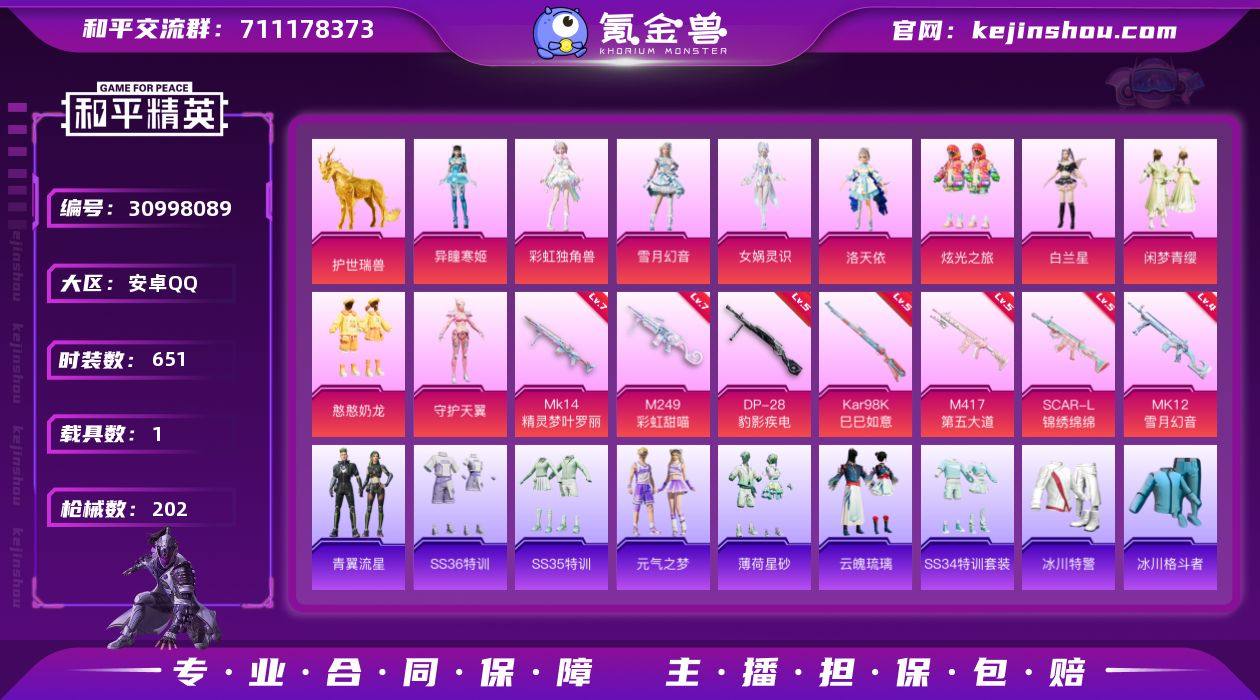 【双字ID 仙女裙子号】安卓Q-1载具10粉装7特效枪6热门177套装194枪皮 13印记 历史卓越王牌10星 【1载具】 护世瑞兽 【10粉装】 女娲灵识 白兰星 憨憨奶龙 洛天依 雪月幻音 异瞳寒姬 彩虹独角兽 炫光之旅 守护天翼 闲梦青缨 【7特效枪】 SCAR-L-锦绣绵绵 (5级) Kar98K-巳巳如意 (5级) DP-28-豹影疾电 (5级) Mk14-精灵梦叶罗丽 (7级) MK12-雪月幻音 (4级) M417-第五大道 (5级) M249-彩虹甜喵 (7级) 【6热门】 龟仙人 晶辉守护 小狗蛇点点 冰爽海盐 破蛋小黄鸡 极速红龙 【2飞行器】 萌物绒绒飞行器 星夜魔法师飞行翼
