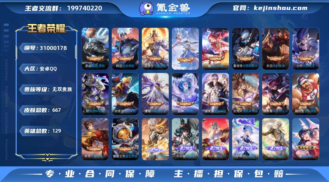 贵族等级:无双贵族 典藏皮肤数:18 珍品无双皮肤数:0 无双皮肤数:9 珍品传说皮肤数:6 传说皮肤数:114 史诗皮肤数:224 皮肤数:667 英雄数:129 段位:荣耀王者 卖家说:1